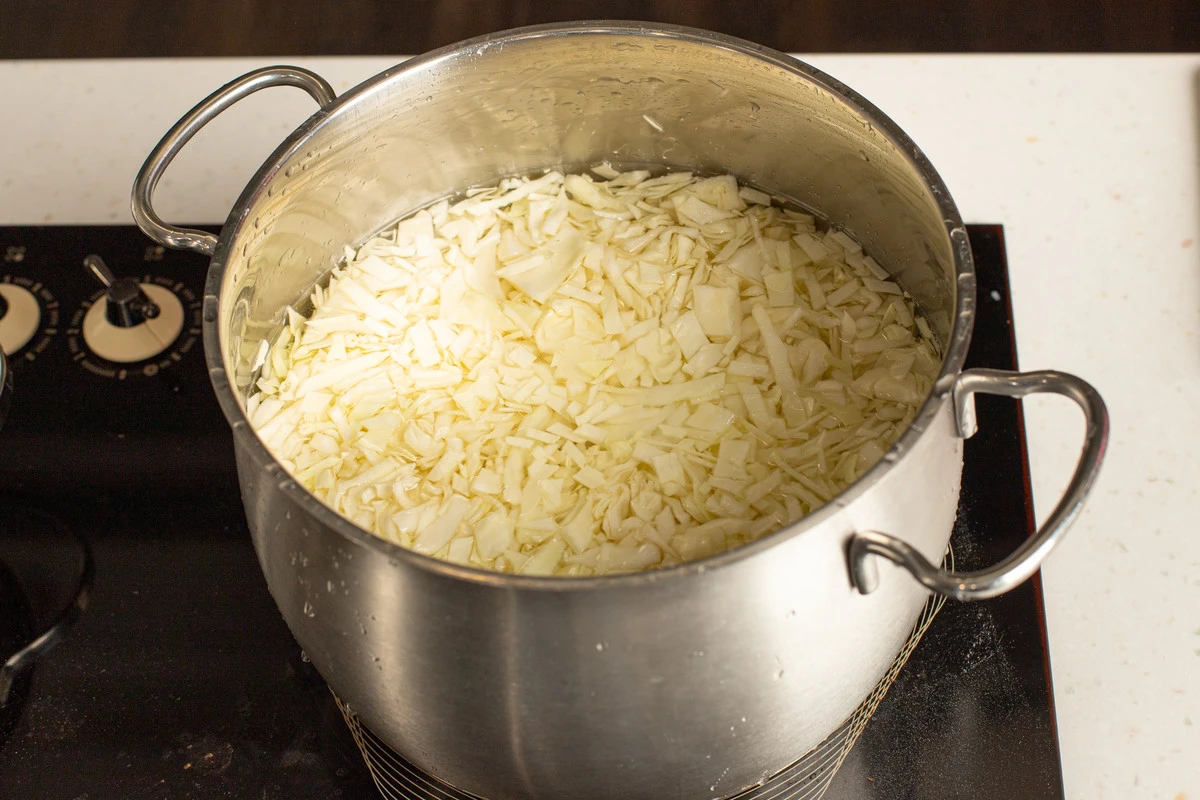 Пока тесто подходит, приготовьте начинку. Нашинкуйте мелко капусту, положите в кастрюлю и залейте горячей водой.