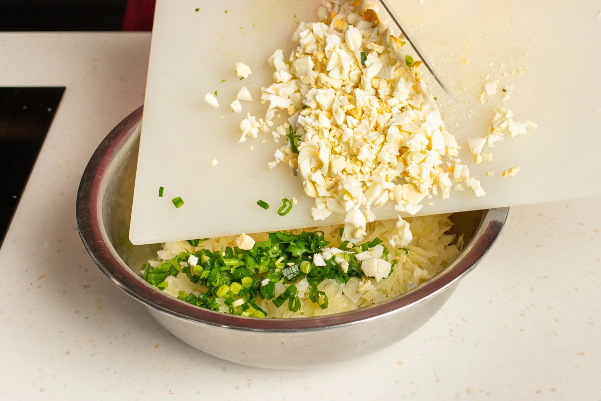 Капусту хорошо отожмите от воды и остудите. Смешайте с яйцами, при необходимости досолите и поперчите по вкусу. Можно также добавить в начинку мелко нарезанный зелёный лук.
