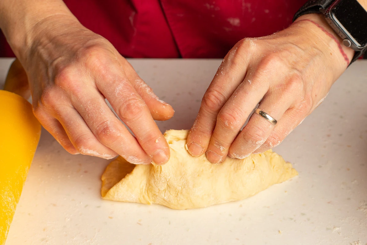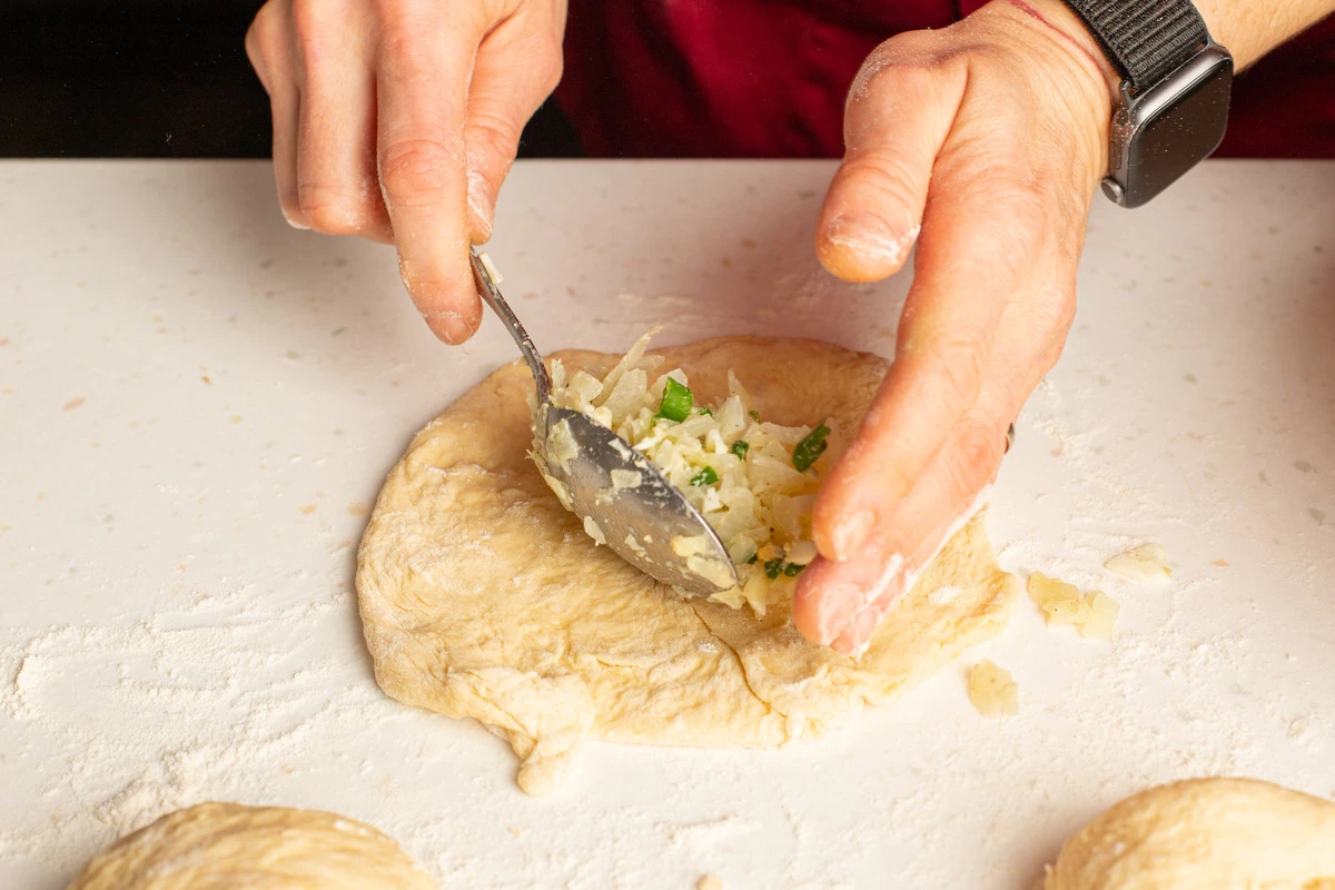 Каждый кусочек теста раскатайте или растяните руками, положите в центр начинку (2-3 ч. ложки на пирожок).