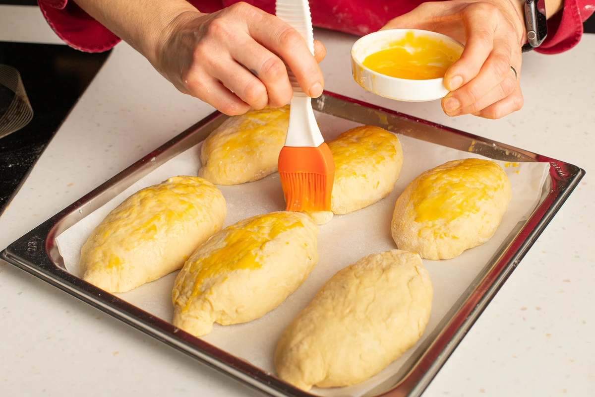 Выложите пирожки на противень. Смажьте оставшимся сырым яйцом и выпекайте около 25 минут при 180 ℃ до золотистости.