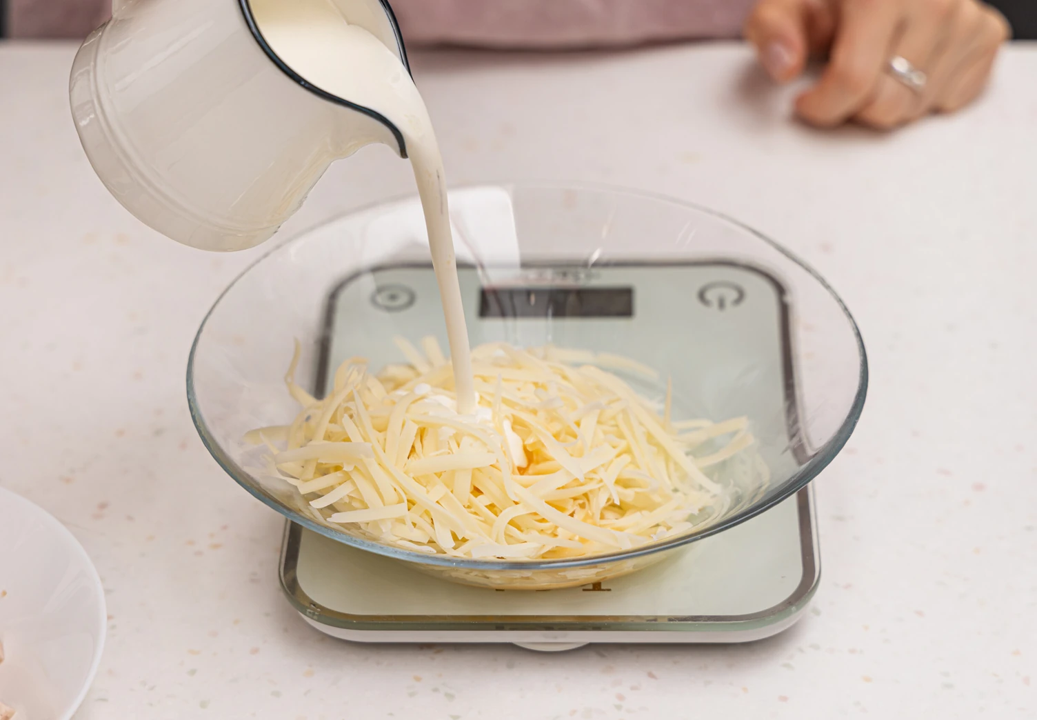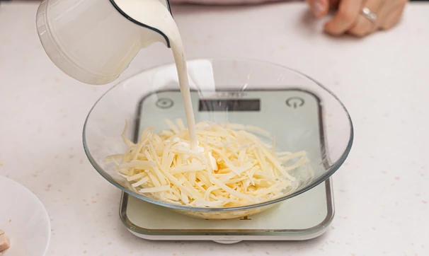 Сыр натрите на крупной тёрке и смешайте со сливками.