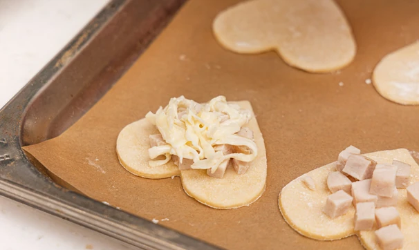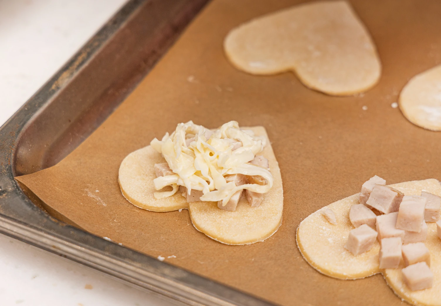 Подошедшее тесто раскатайте в пласт толщиной 3–4 мм. Вырежьте с помощью формы сердечки. Положите в центр половины из них немного ветчины, затем сливочно-сырную массу.