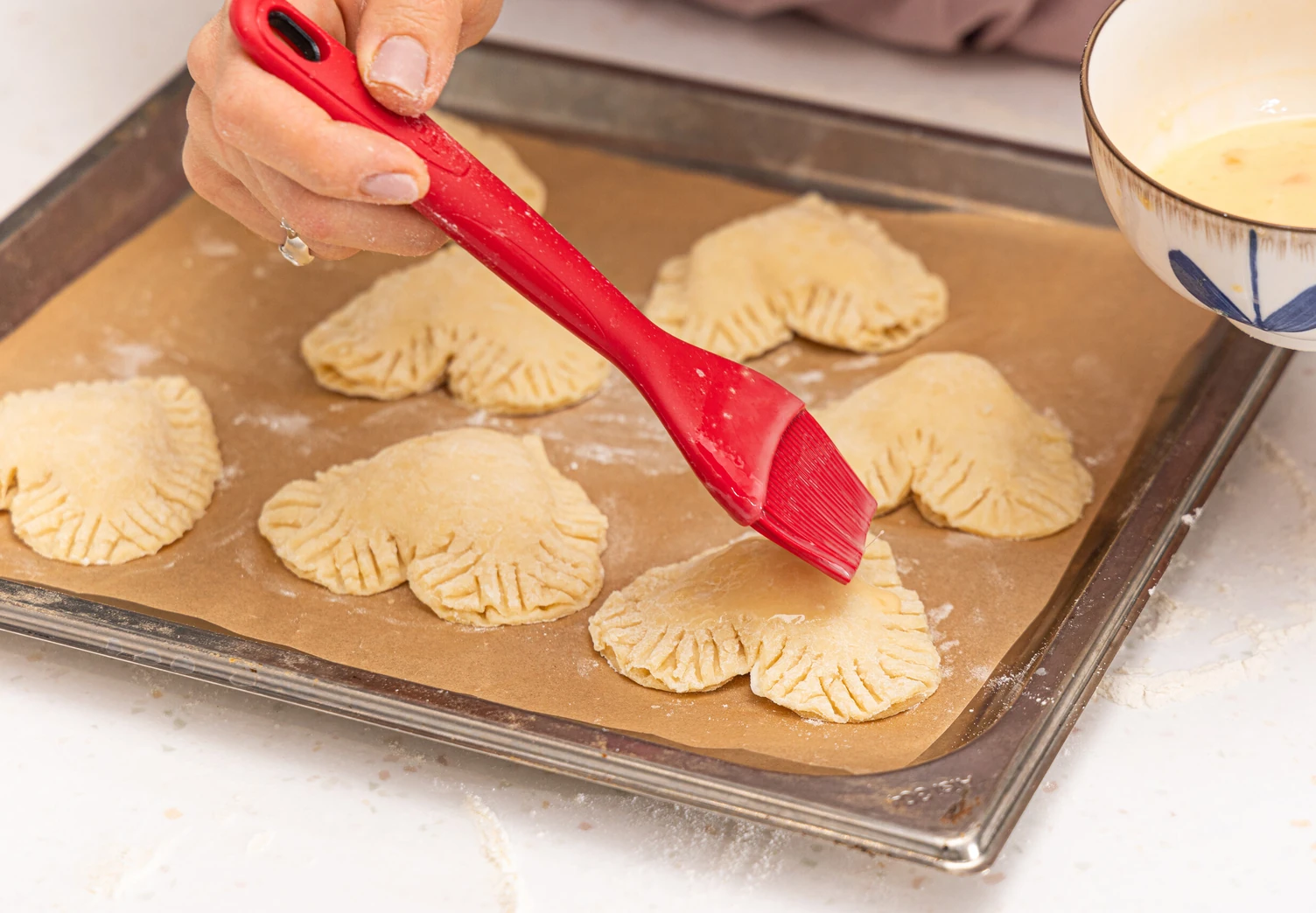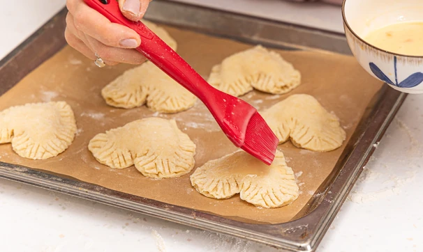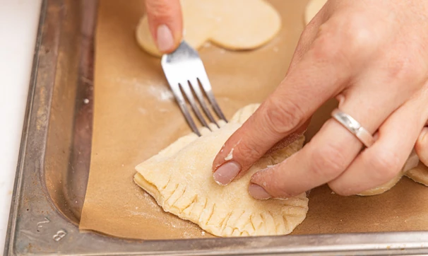 Накройте сердечки с начинкой оставшимися половинками и пройдитесь вилкой по контуру каждого пирожка для дополнительной фиксации.
