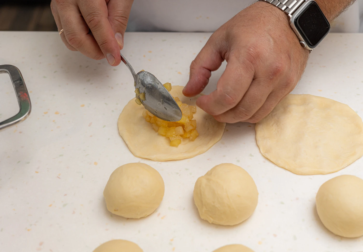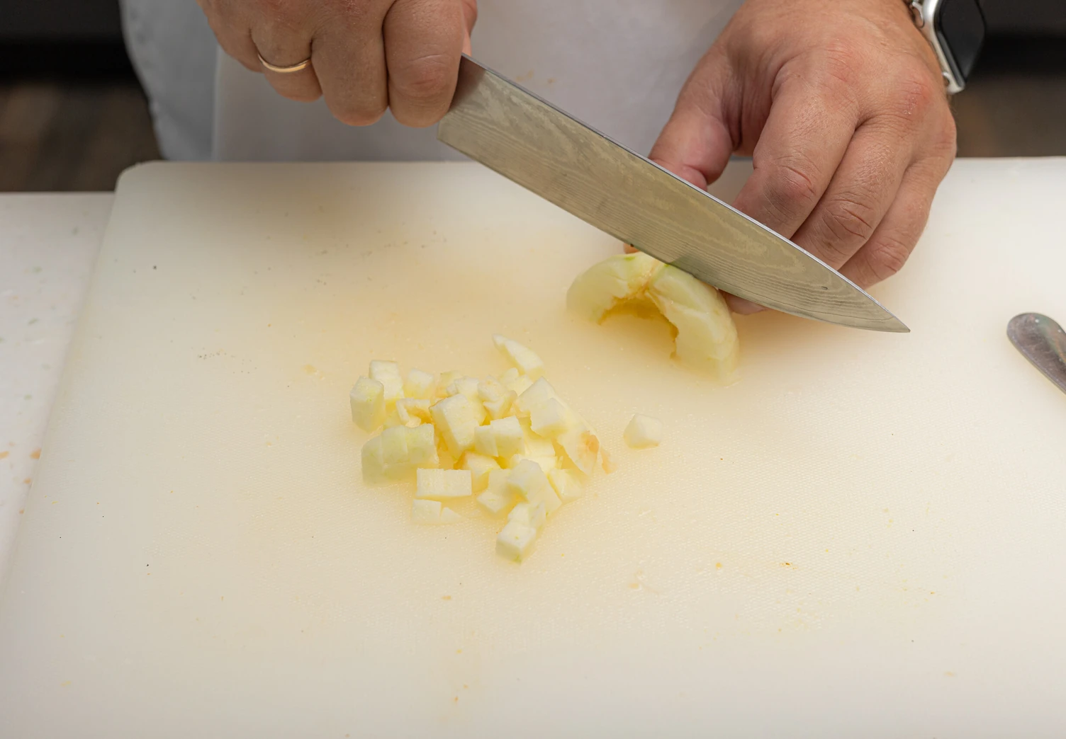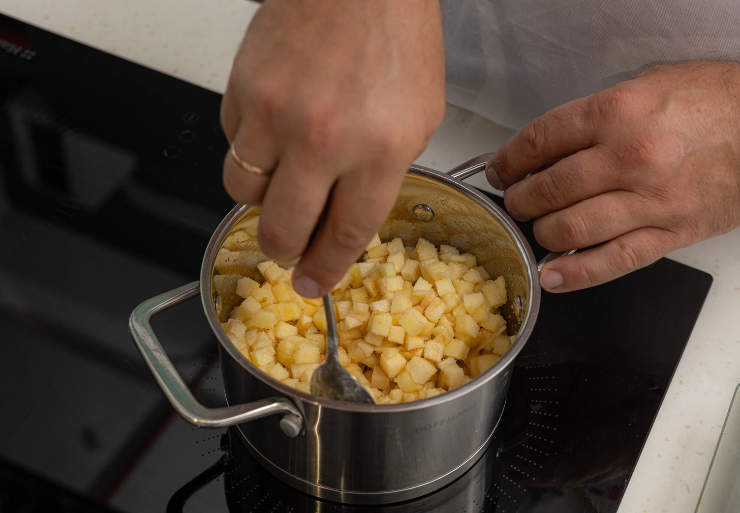 Варите яблоки, помешивая, в течение 8–10 минут. Нужно, чтобы они немного размягчились, но сохранили форму кубиков. Дайте готовой начинке остыть.