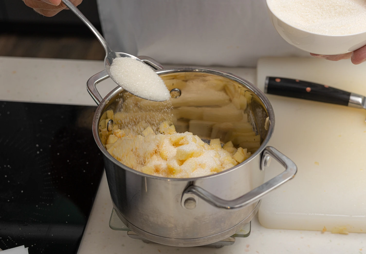 Переложите яблоки в сотейник, засыпьте 50 г сахара (его количество можно менять в зависимости от сладости фруктов и ваших предпочтений) и поставьте на небольшой огонь.
