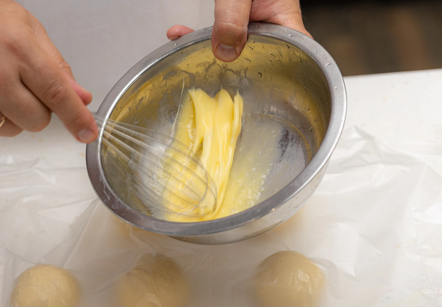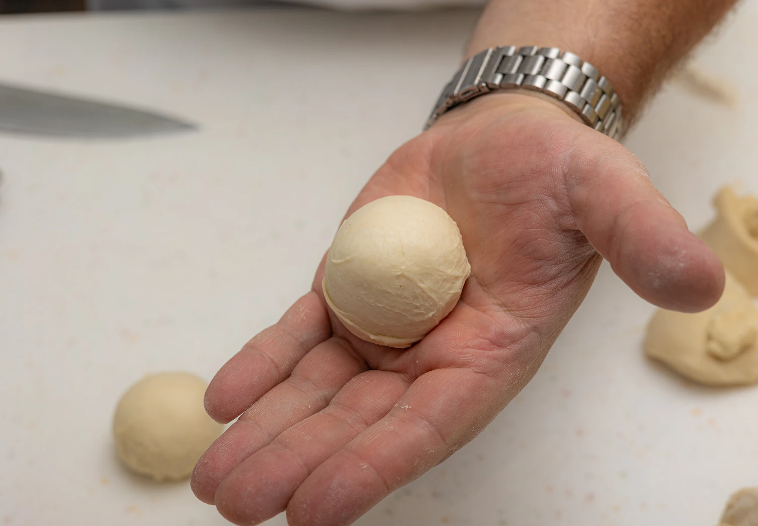 Скатайте из теста колбаску и разделите на 8 равных частей.