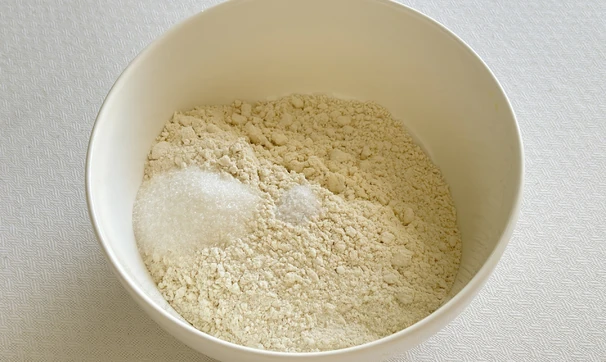 В миске смешайте сухие ингредиенты: дрожжи, муку, соль и сахар.