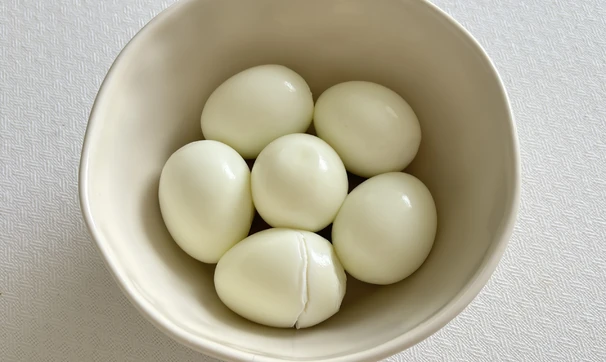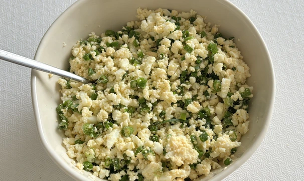 Слейте воду и поставьте яйца под холодную струю воды. Очистите яйца от скорлупы, промойте их, чтобы полностью удалить частицы скорлупы, и измельчите вилкой до состояния крошки.