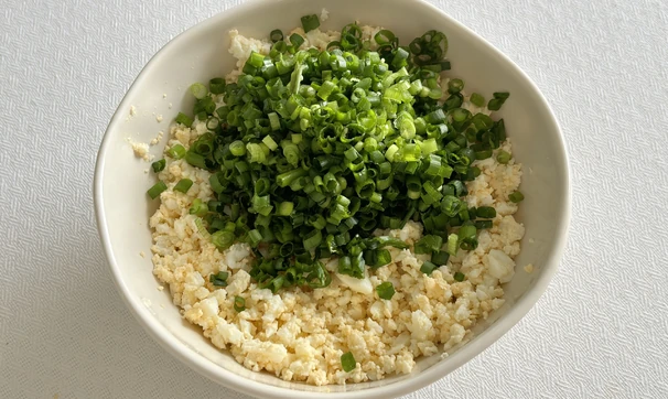 Мелко нарежьте лук, добавьте его к яйцам и посыпьте солью.