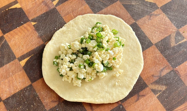 Раскатайте каждую часть в пласт, в середину выложите 3–4 столовые ложки начинки.