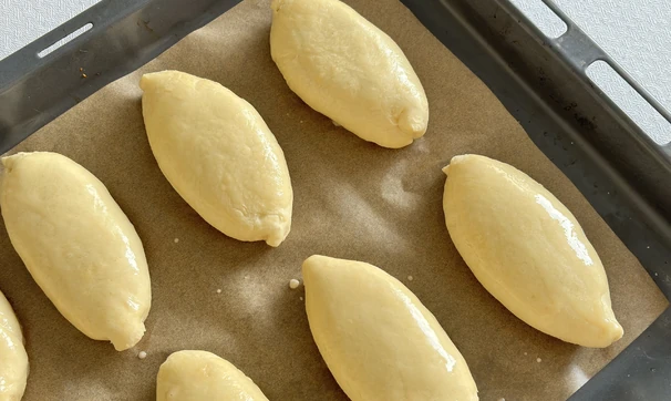 После того как пирожки поднимутся, смажьте их яйцом, слегка взбитым с молоком, отправьте их в духовку на 20–25 минут при температуре 180°C.
