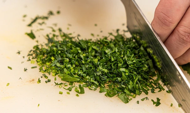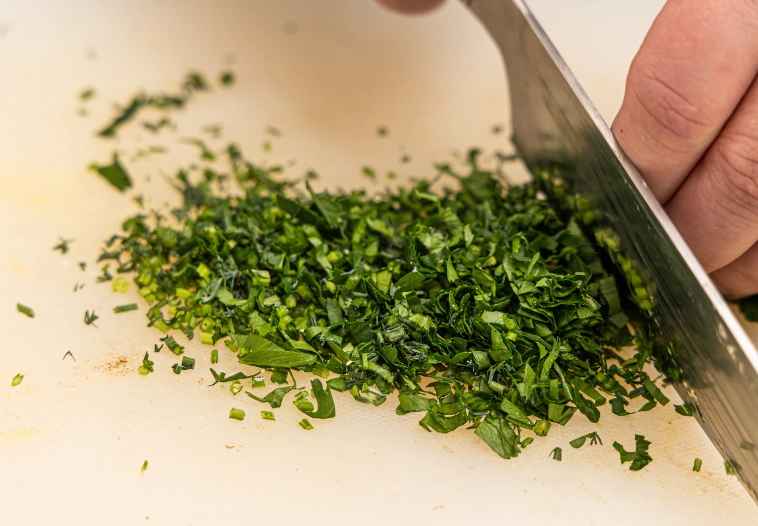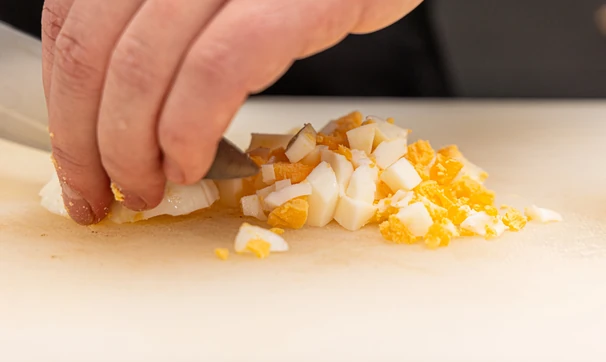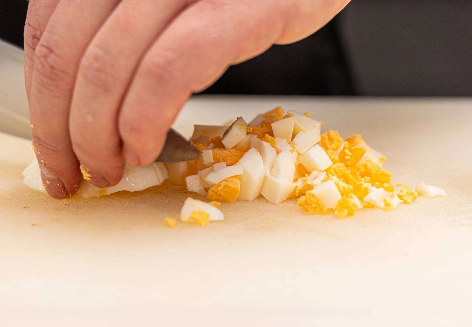Два яйца из трёх сварите вкрутую и мелко порубите.