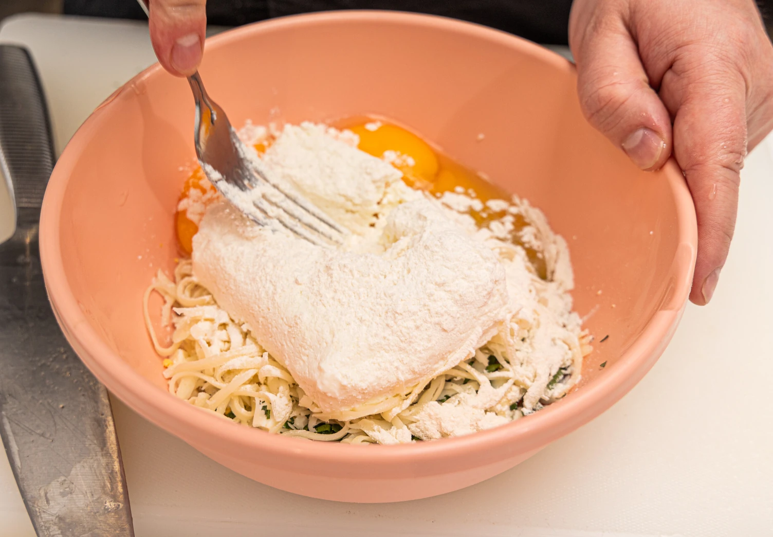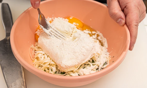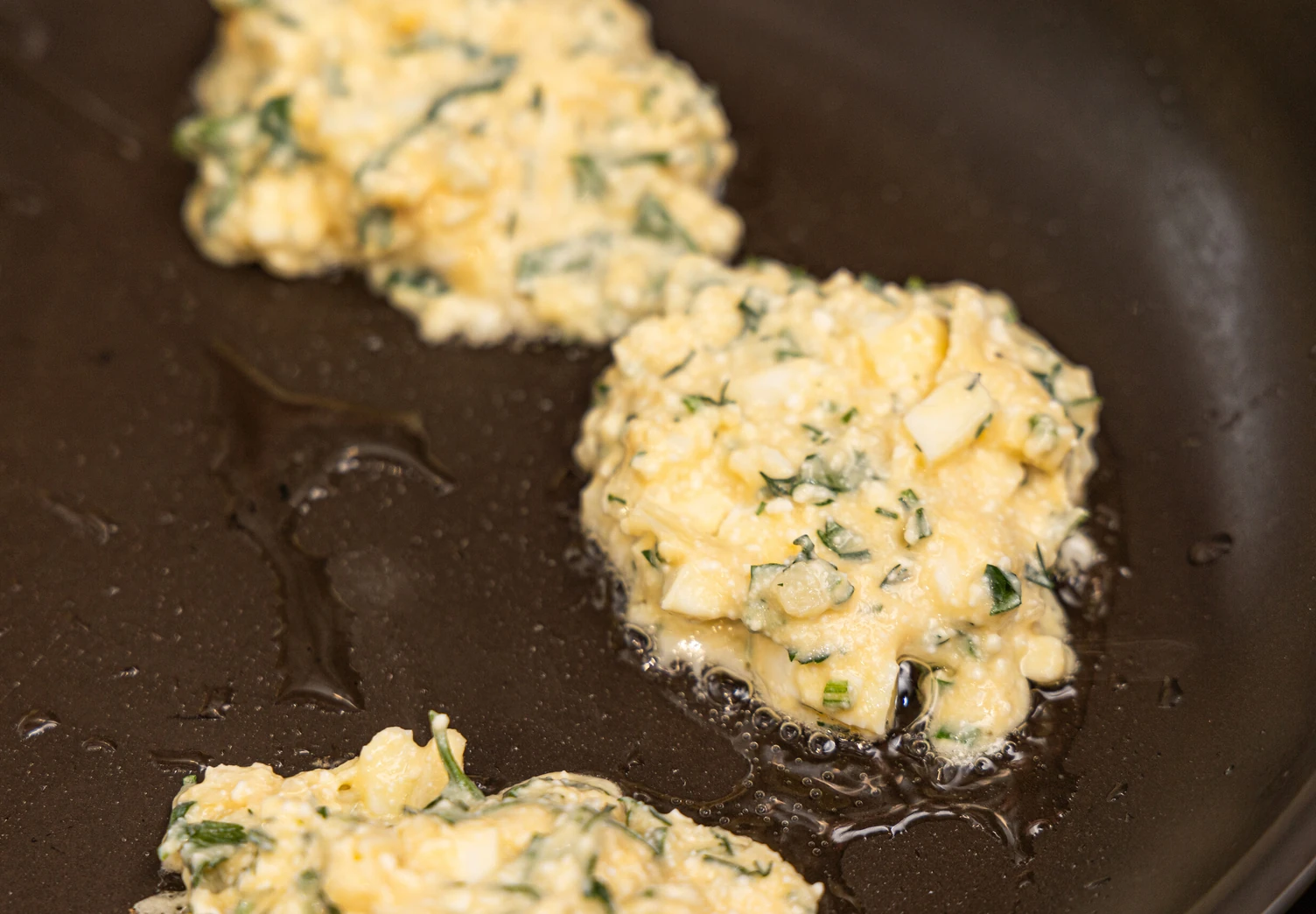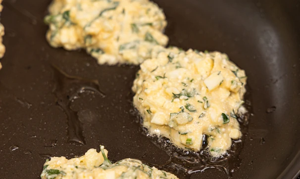 Сформируйте из полученной массы лепёшки на манер сырников и обжарьте на растительном масле до золотистого цвета с двух сторон.