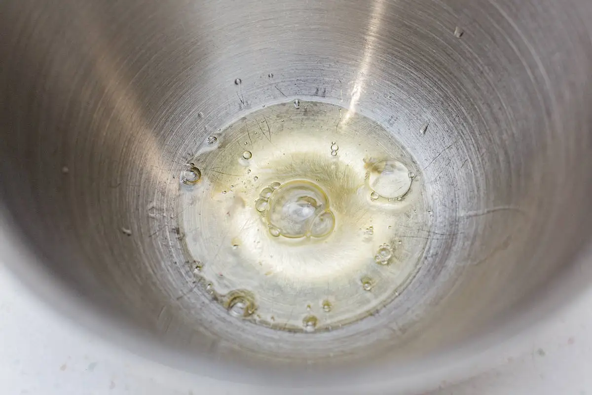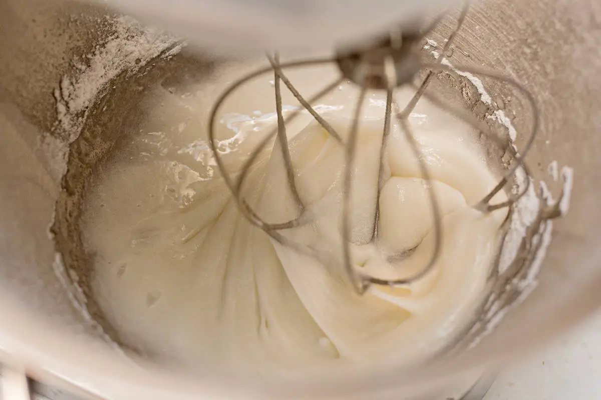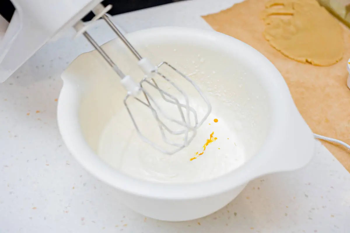 Для взбивания вам понадобится большая, обязательно чистая и сухая миска и миксер с венчиками (блендер с ножами не подойдёт). Взбейте белки с капелькой уксуса до пышной пены и твёрдых пиков.