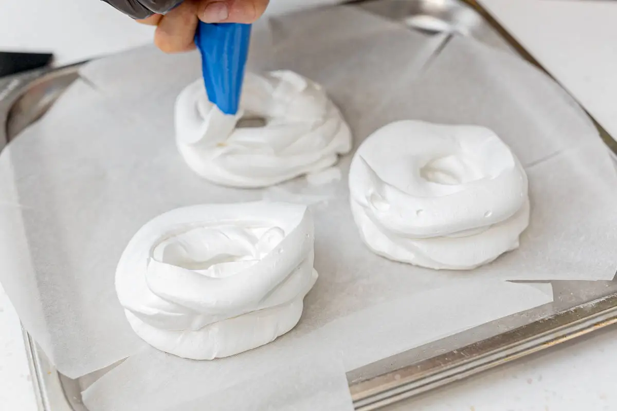 Противень застелите пергаментом. На пергаменте для удобства нарисуйте круги нужного диаметра и выложите по ним белковую массу при помощи ложки или кондитерского мешка. В нашем примере получилось 3 достаточно высоких корзинки примерно по 12 см в диаметре.