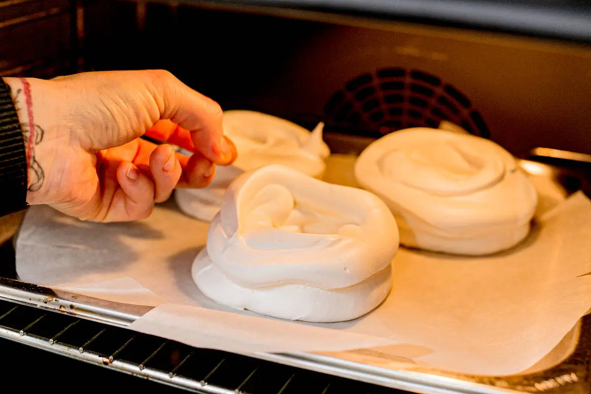 Поставьте пирожные в разогретую до 130 °C духовку на 10 минут, затем убавьте жар до 60 °C и выпекайте ещё 50 минут до сухой корочки. Готовые меренги остудите. Можно сразу наполнить их кремом и ягодами и подавать, а можно хранить в сухом прохладном месте 2-3 дня.
