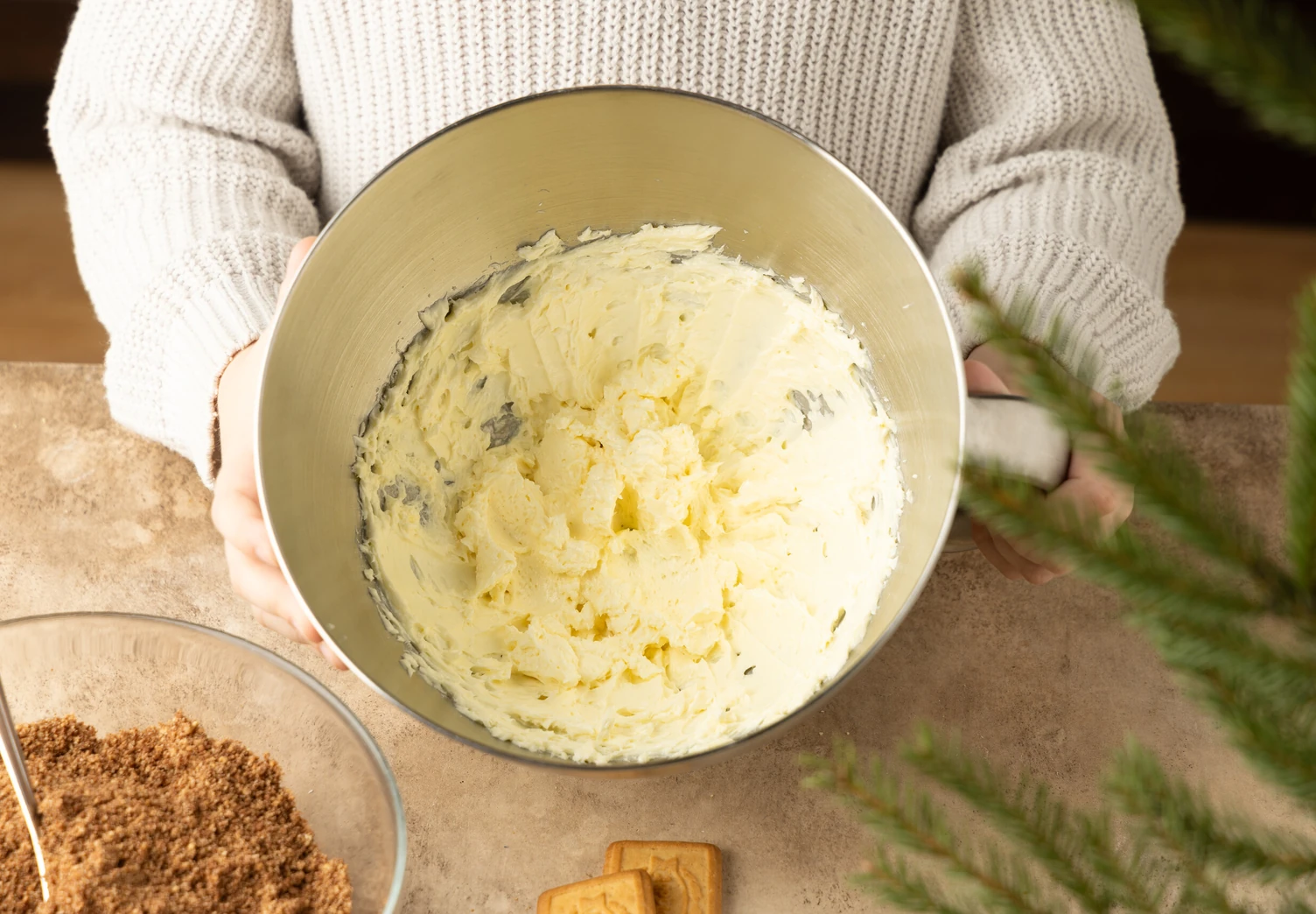 Соедините сухие ингредиенты с масляным кремом и замесите тесто. Удобнее всего это делать миксером с насадкой-крюком. Охладите получившееся тесто в течение примерно 15 минут, чтобы удобнее было лепить из него шишки.