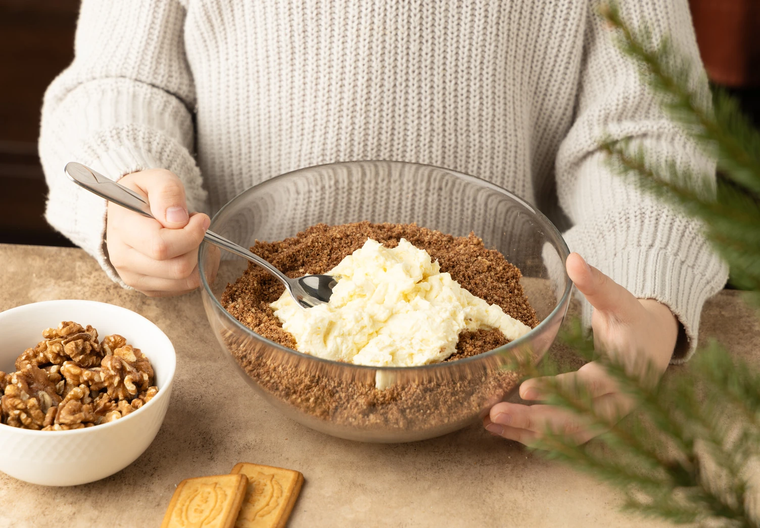 В большой миске смешайте измельчённое печенье, орехи и какао-порошок. Перемешайте до соединения компонентов.