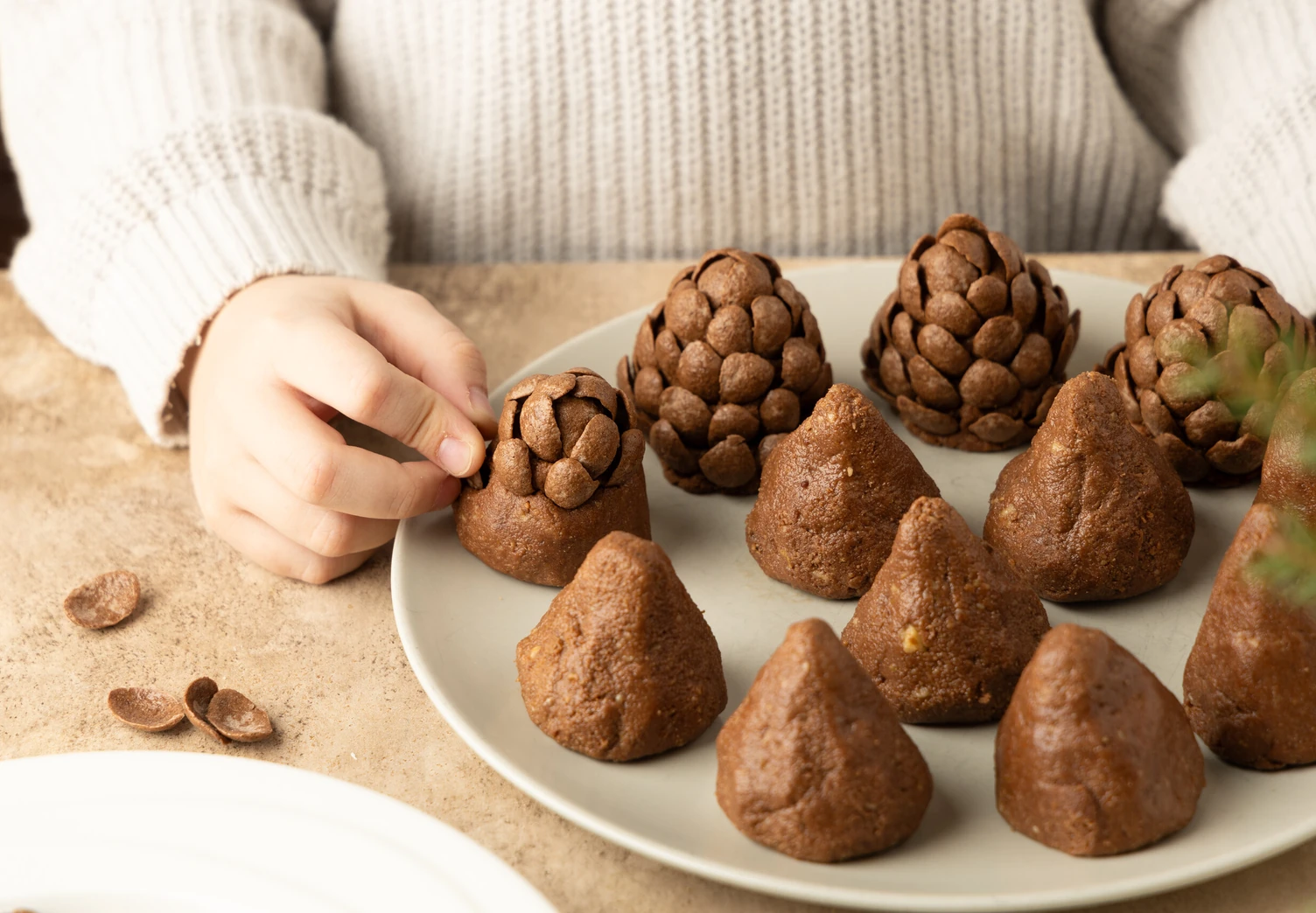 Слепите из охлаждённого теста конусы — будущие шишки — весом примерно 50 г каждый. Начиная с верхней части, аккуратно втыкайте шоколадные ракушки в конус по кругу, чтобы получились шишки.