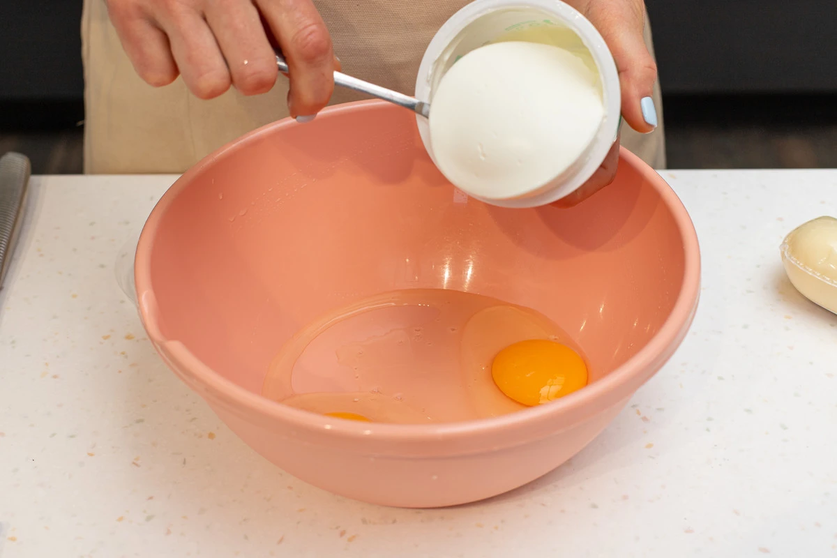 В большую миску разбейте яйца, добавьте сметану и перемешайте.