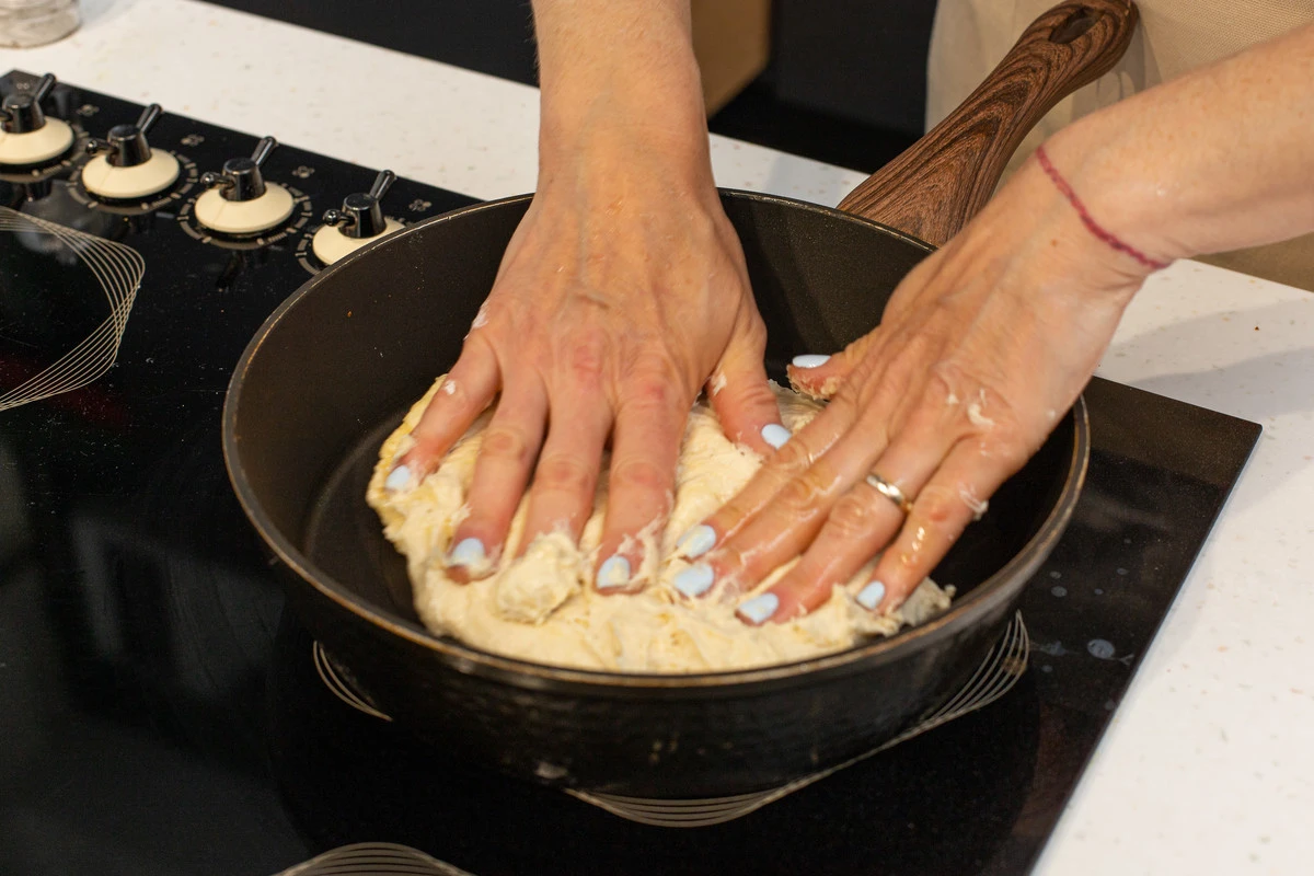 На хорошо разогретую сковородку выложите тесто, разровняйте, жарьте до корочки на одной стороне — 7-8 минут на среднем огне.