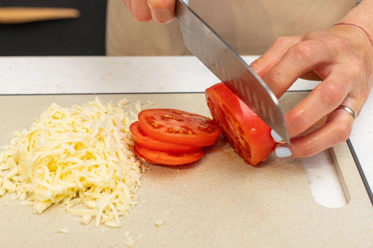 Измельчите сыр на тёрке, ветчину нарежьте ломтиками, помидор — кружочками.