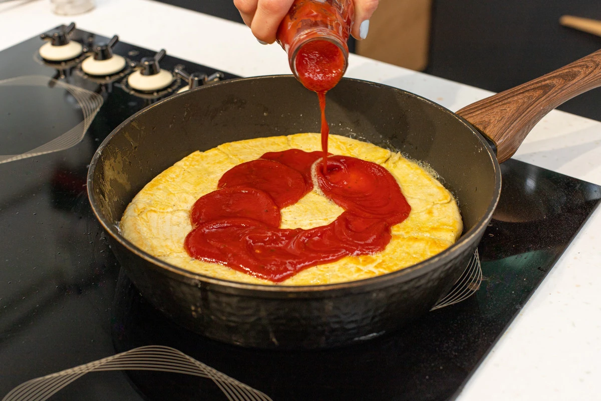 Переверните тесто, налейте томатный соус и размажьте по основе.