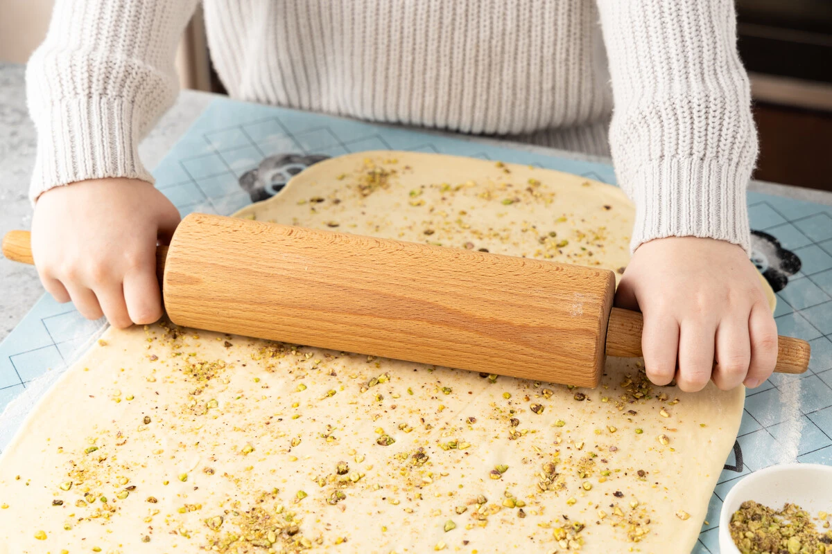 Слегка присыпьте рабочую поверхность мукой. Тесто раскатайте в прямоугольник размером примерно 45 х 30 см. Горсть фисташек измельчите. Равномерно распределите по пласту теста 2 ст. л. с горкой молотых орехов и впечатайте их в тесто с помощью скалки.
