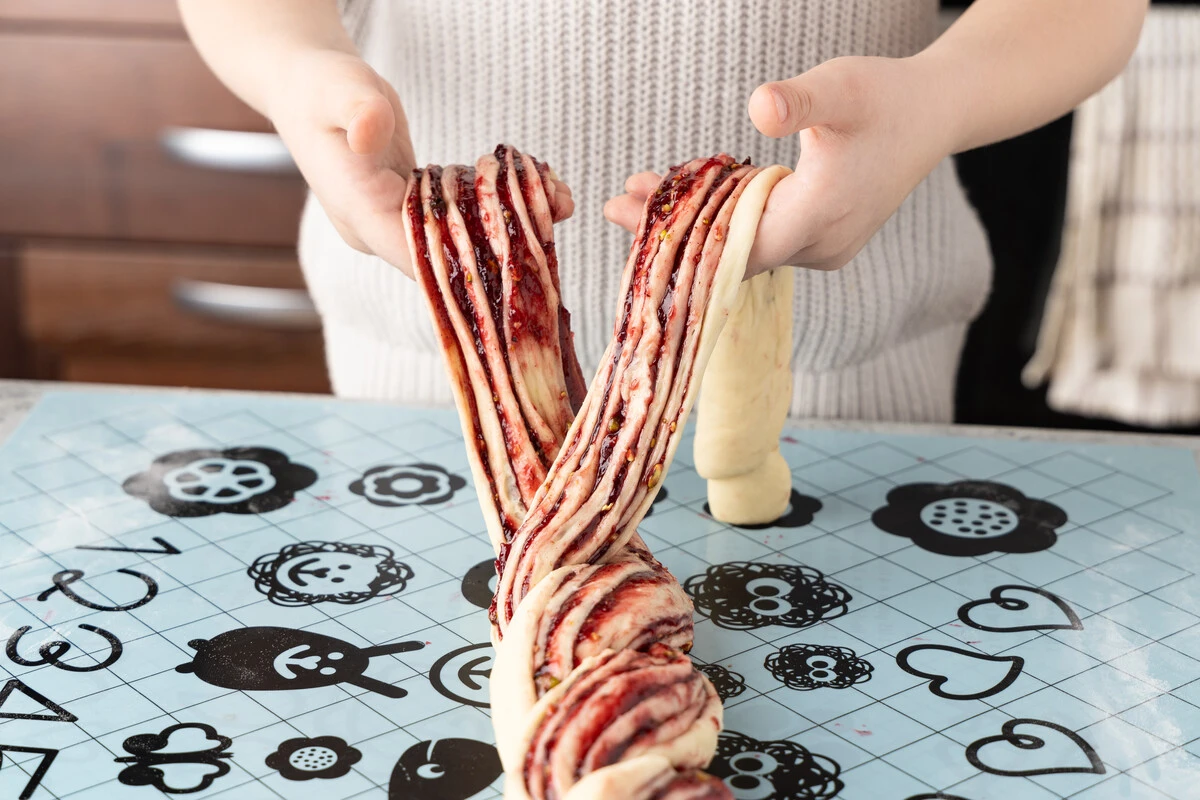 Разрежьте рулет вдоль острым ножом на 2 равные полоски. Положите их рядом разрезом вверх. Перекиньте одну полоску через другую, затем ещё и ещё и так до самого конца — будто заплетаете косу. Следите, чтобы срез теста всегда «смотрел» строго вверх.