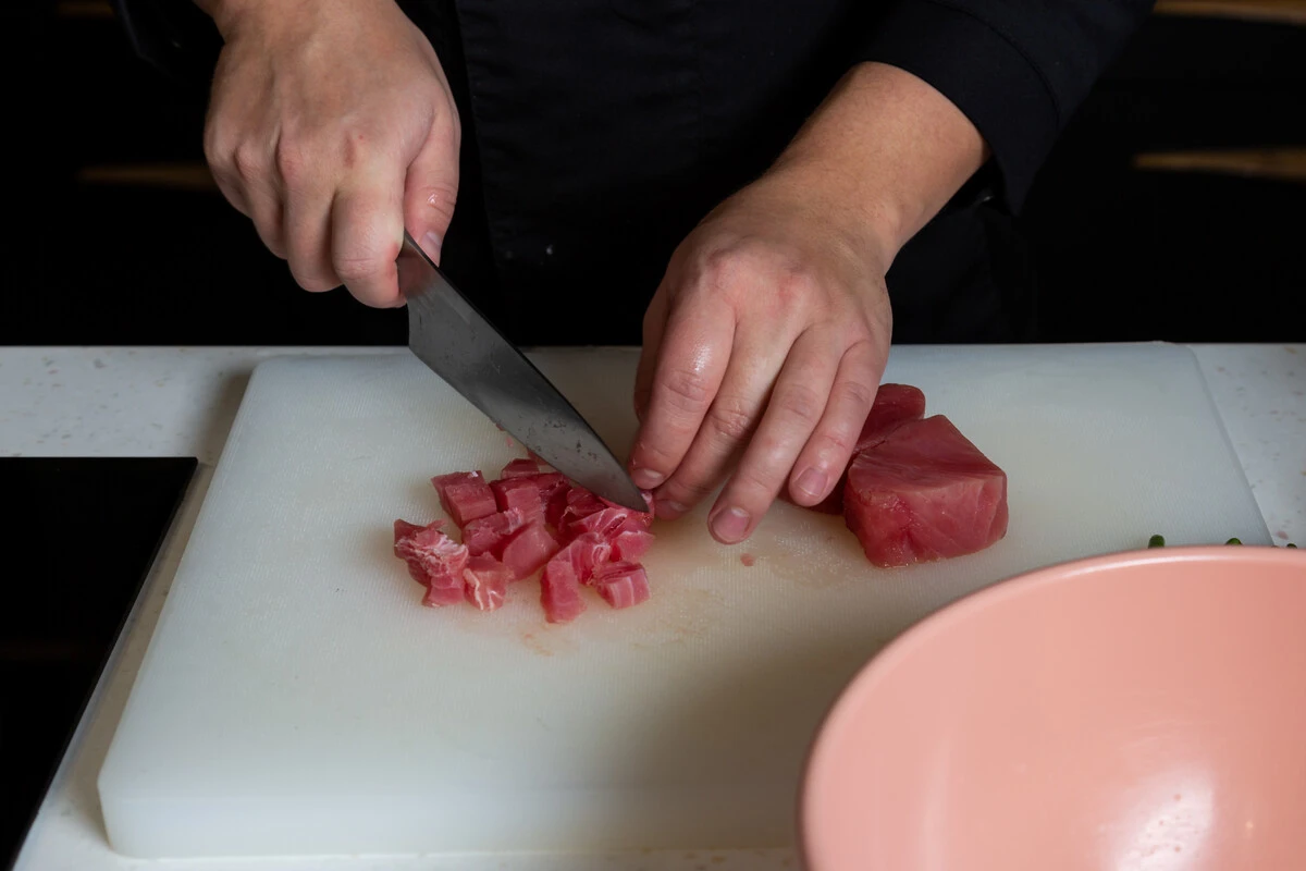 Яркий и вкусный вариант гавайского поке — с тунцом. Он очень популярен, как и поке с форелью, при этом существует множество комбинаций с овощами и фруктами. В свой вариант поке мы не просто добавили огурец, а припустили его в кипящей воде и чуть подмариновали в соусе — получилось очень интересно.