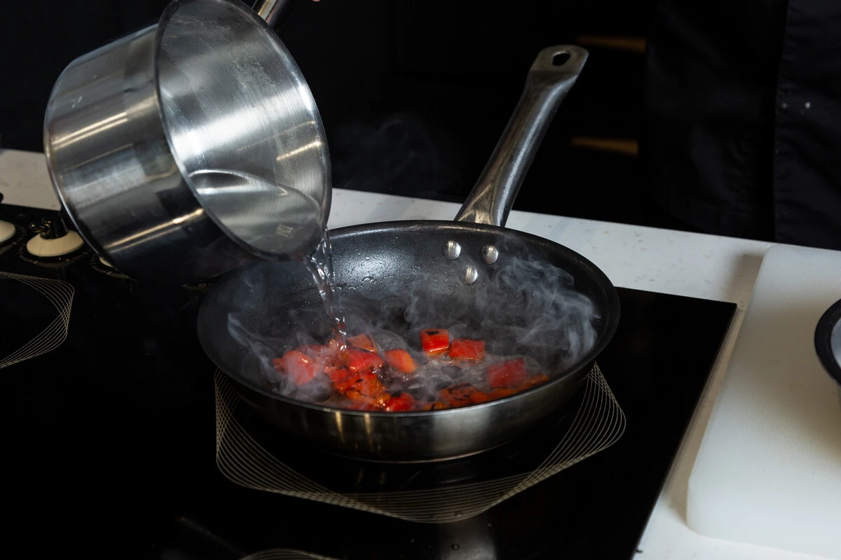 Выложите перец на разогретую сковороду и готовьте примерно 3 минуты до золотистого цвета. Залейте 100 мл горячей воды, готовьте примерно минуту на сильном огне, помешивая, чтобы перец немного размягчился, а вода выпарилась. Выложите перец на тарелку.