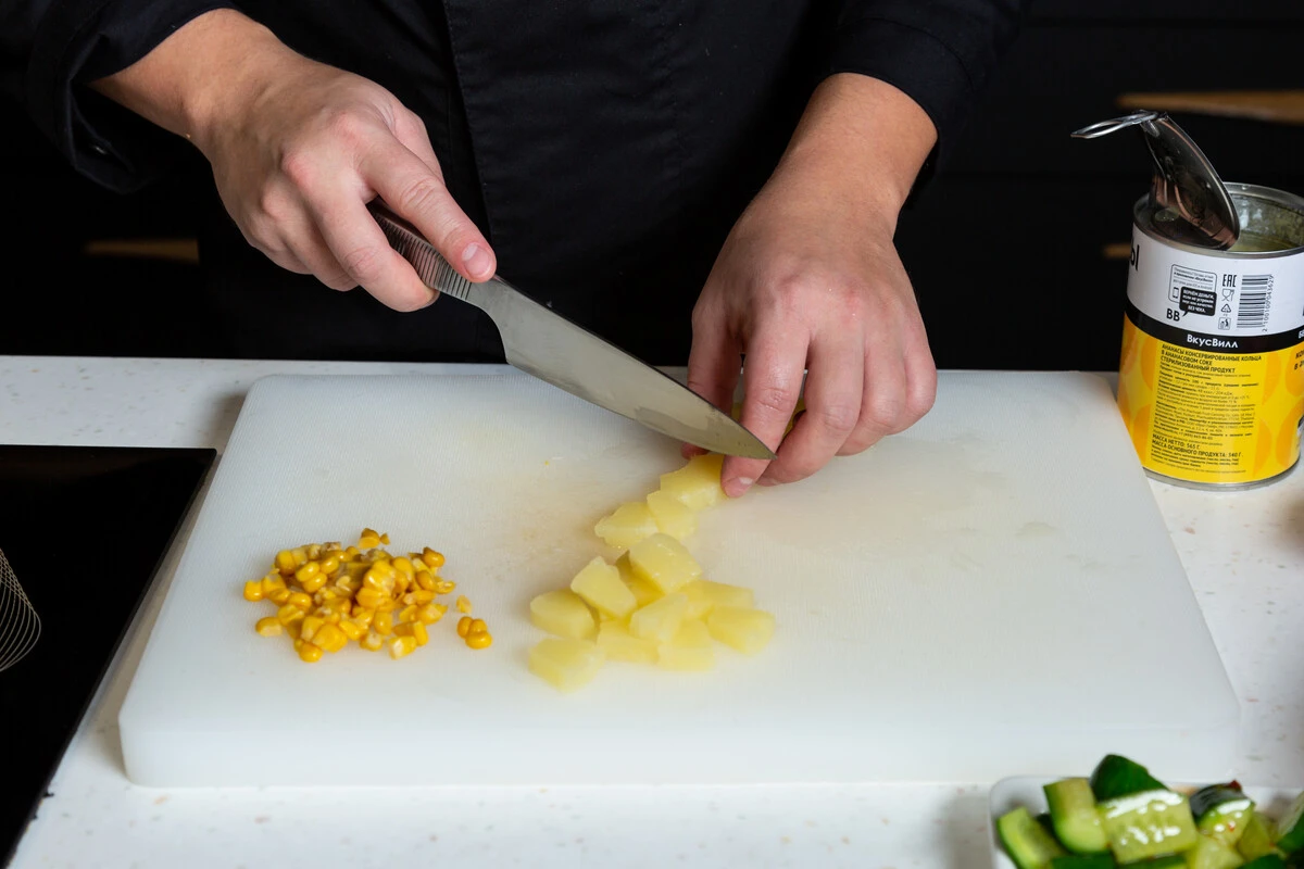 Разморозьте филе тунца. Нарежьте кубиками 15х15 мм.