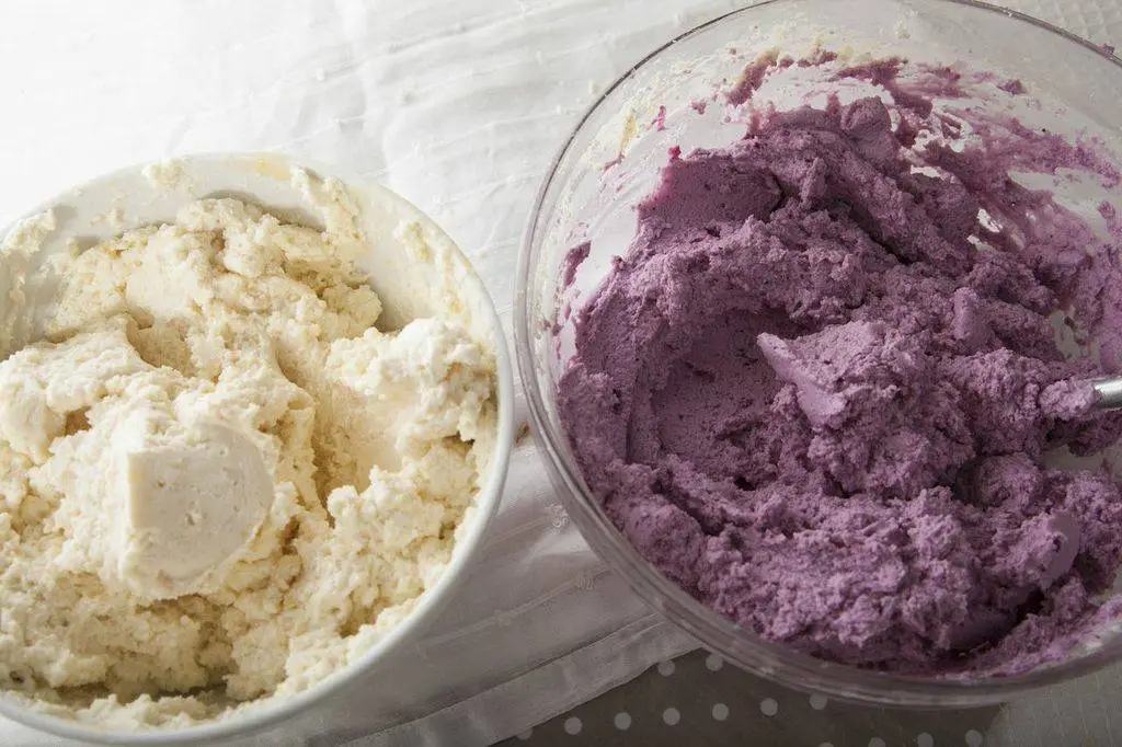 Творог разделите на две равных части, к одной добавьте три столовых ложки сметаны, порубленный миндаль и ваниль (экстракт или ванильный сахар), ко второй чернику и одну столовую ложку сметаны, тащательно перемешайте.