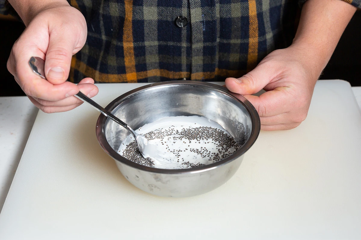 Насыпьте семена чиа в миску, залейте сливками, добавьте соль. Перемешайте и оставьте на 40 минут.