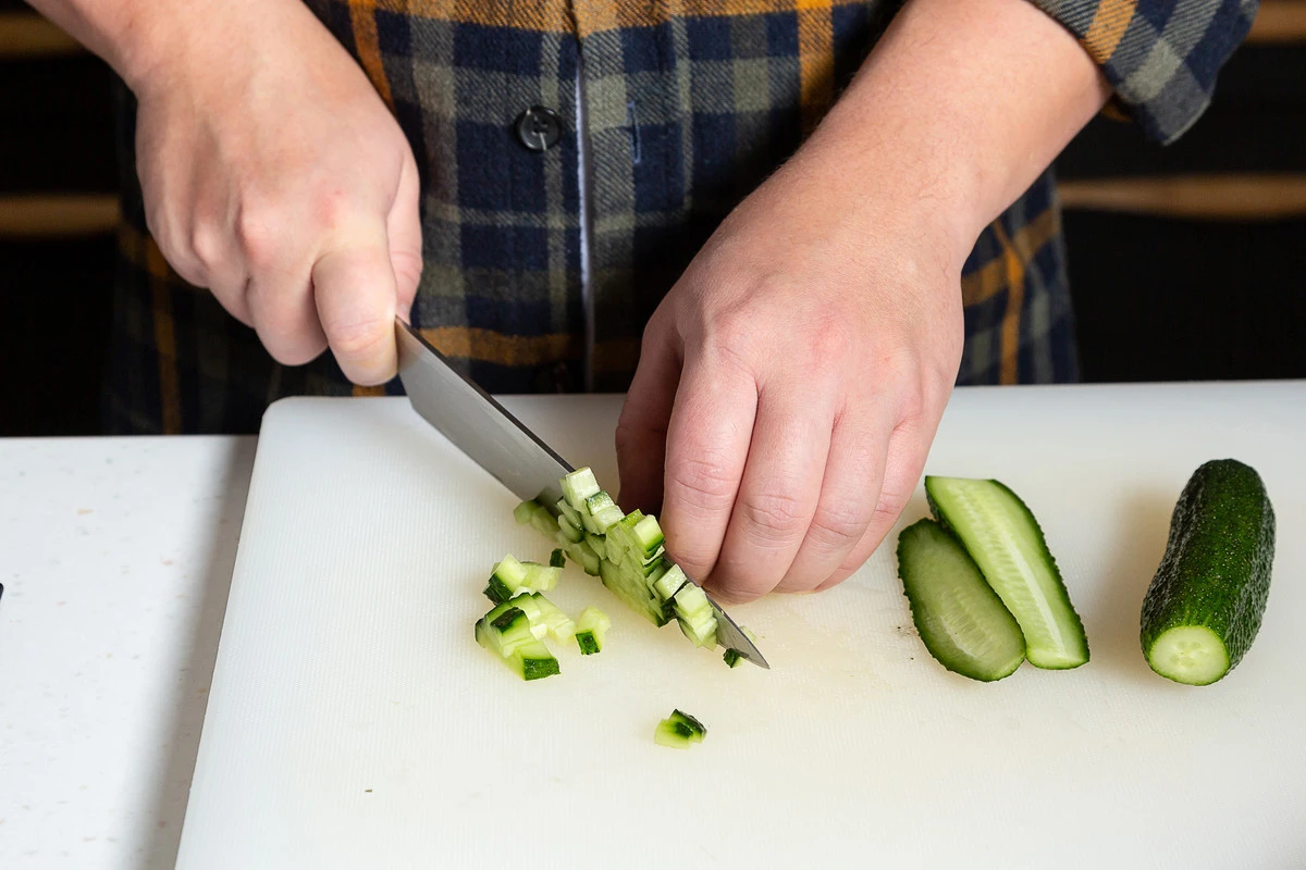 У огурцов срежьте плодоножки. Нарежьте мелкими кубиками.