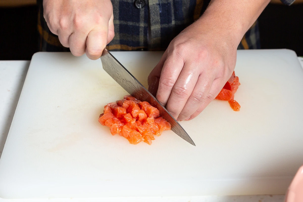У форели удалите косточки и нарежьте филе мелкими кубиками.