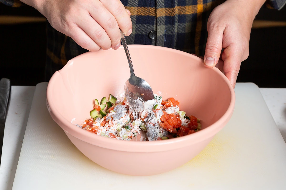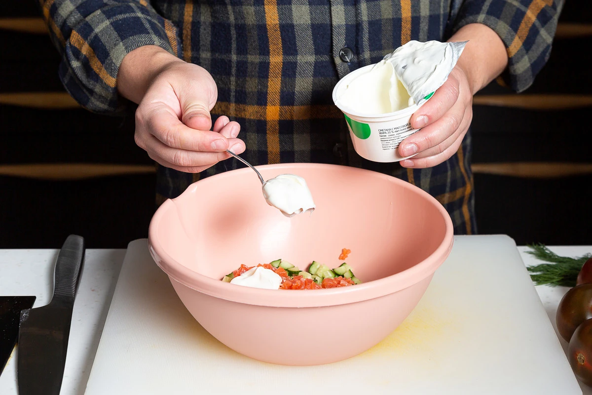 Положите нарезанные огурцы и форель в миску, добавьте сметану и оба вида перца.
