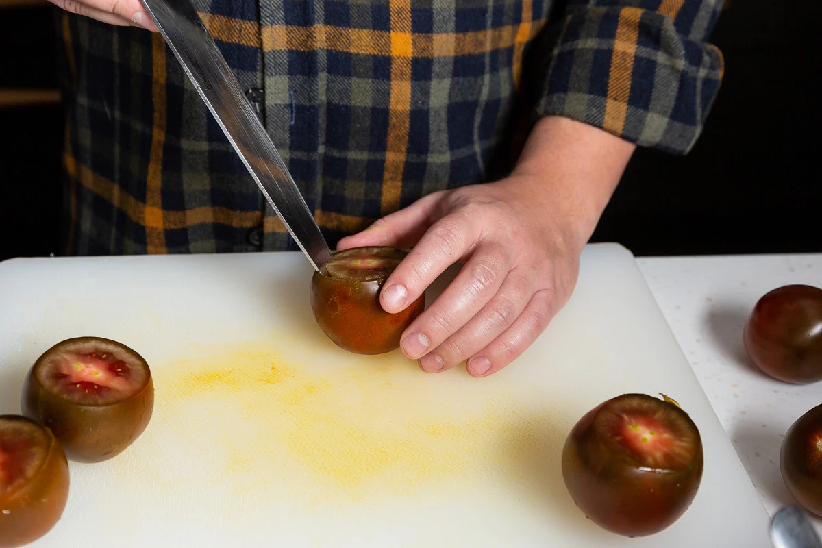 У томатов срежьте «крышечки» с плодоножкой. Аккуратно ложкой достаньте мякоть, стараясь не повредить стенки. Мякоть измельчите блендером с небольшим количеством соли и подавайте как сок или соус.