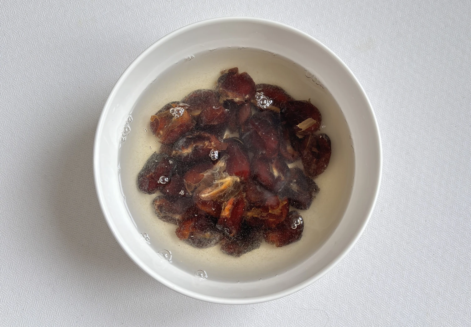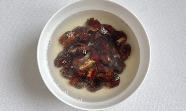 Вытащите из фиников косточки и замочите их в горячей воде на 10 минут.