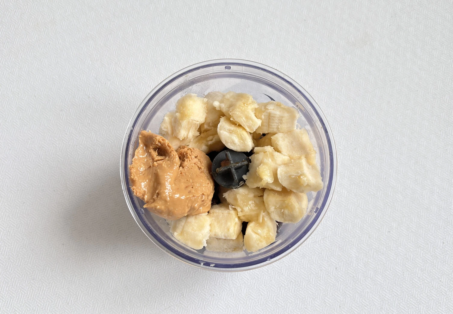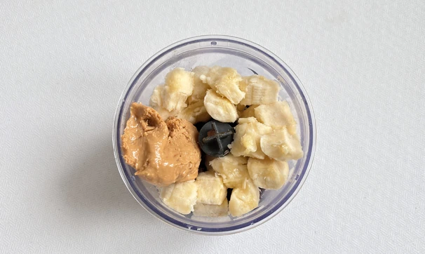 Переложите финики в чашу блендера, добавьте банан и арахисовую пасту. Пробейте до однородности.