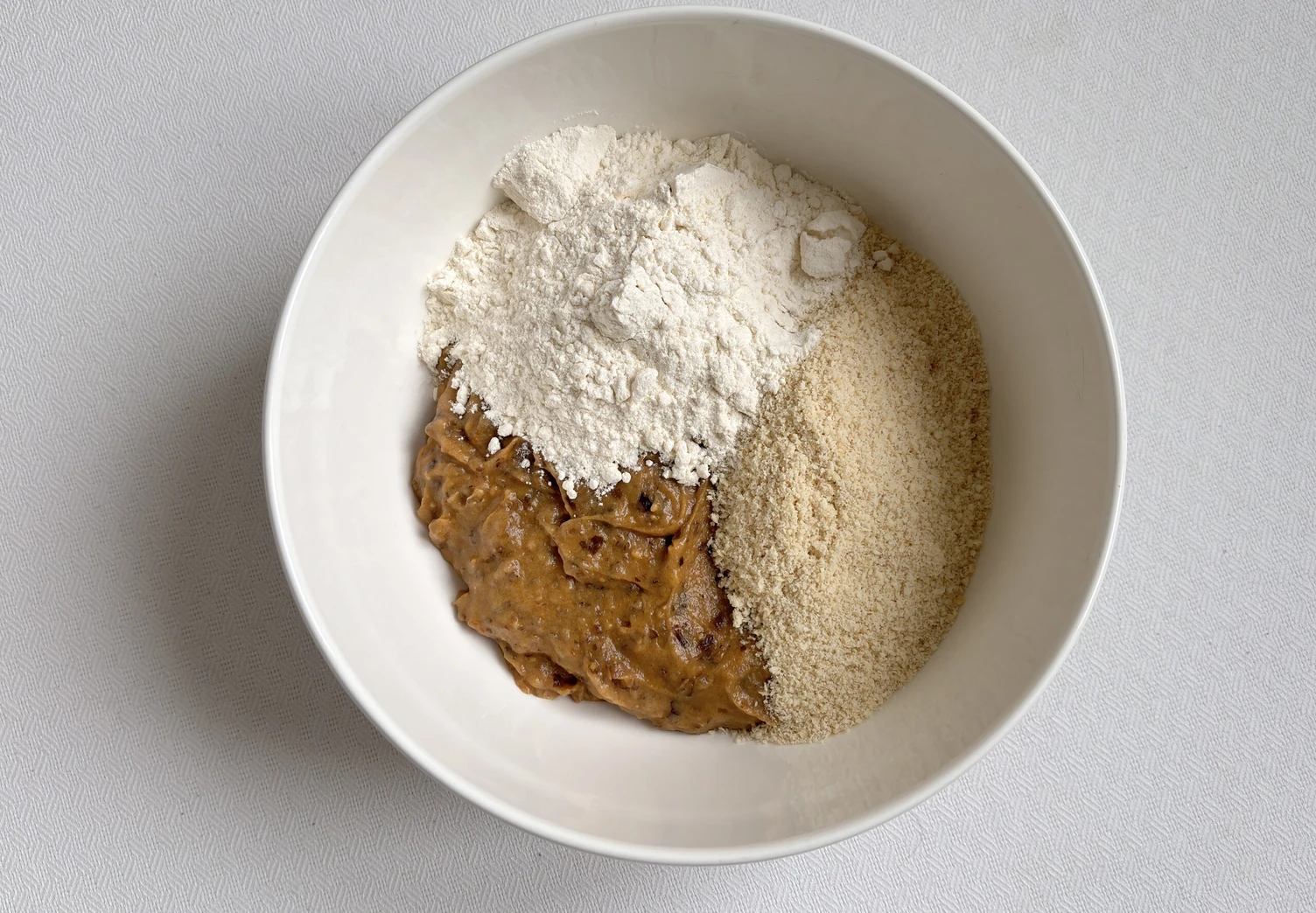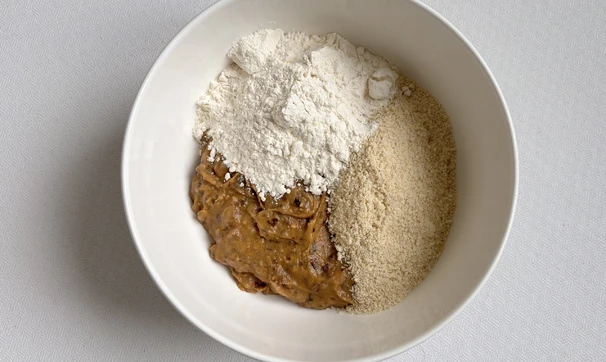 Переложите массу в миску, добавьте миндальную и пшеничную муку и перемешайте.
