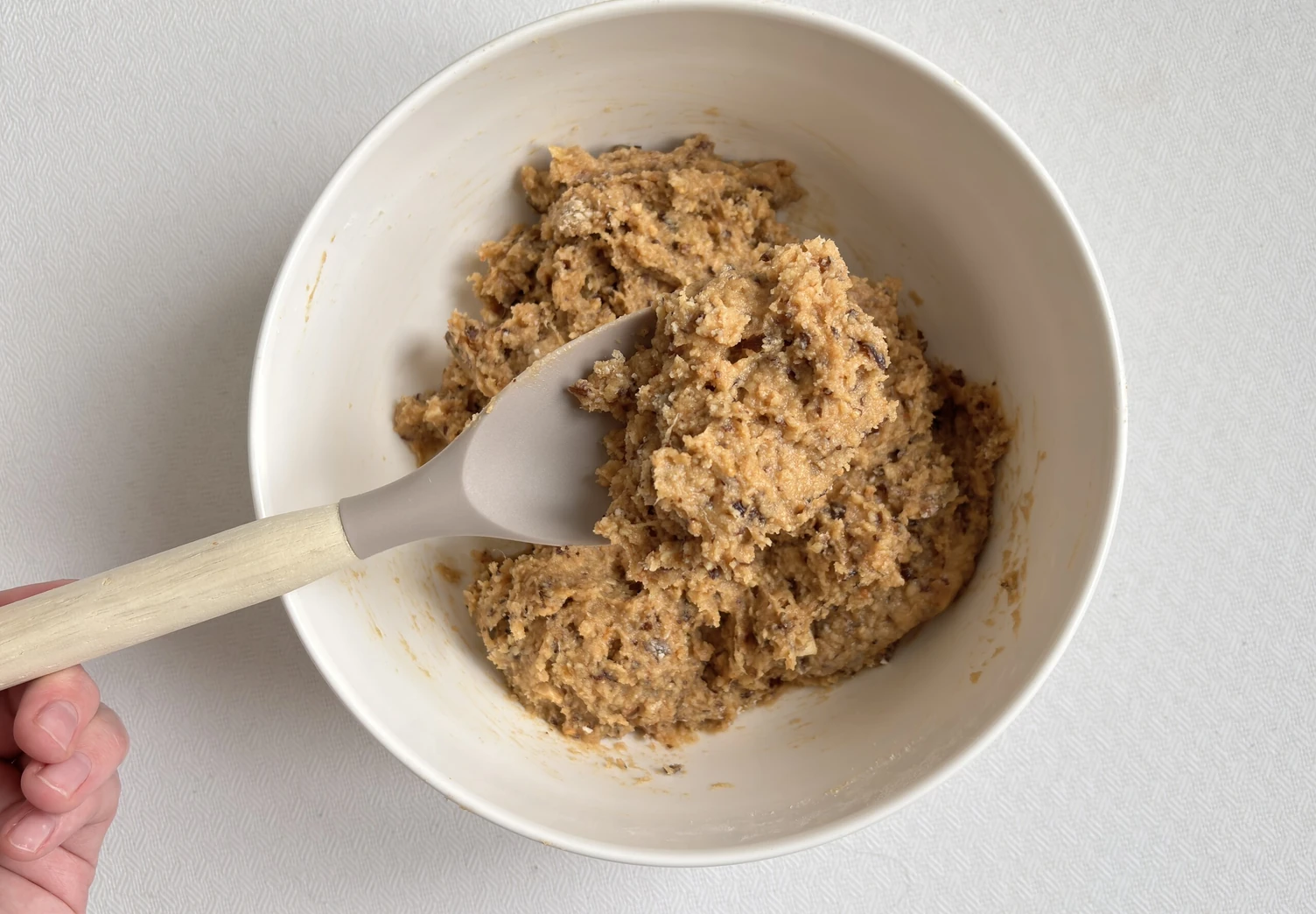 Добавьте дроблёный арахис и снова перемешайте получившееся тесто.