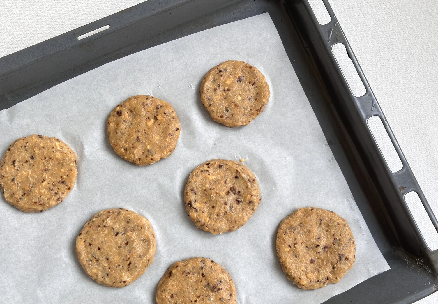 Сформируйте из теста небольшие шарики, выложите их на застеленный пергаментом противень и слегка приплюсните.