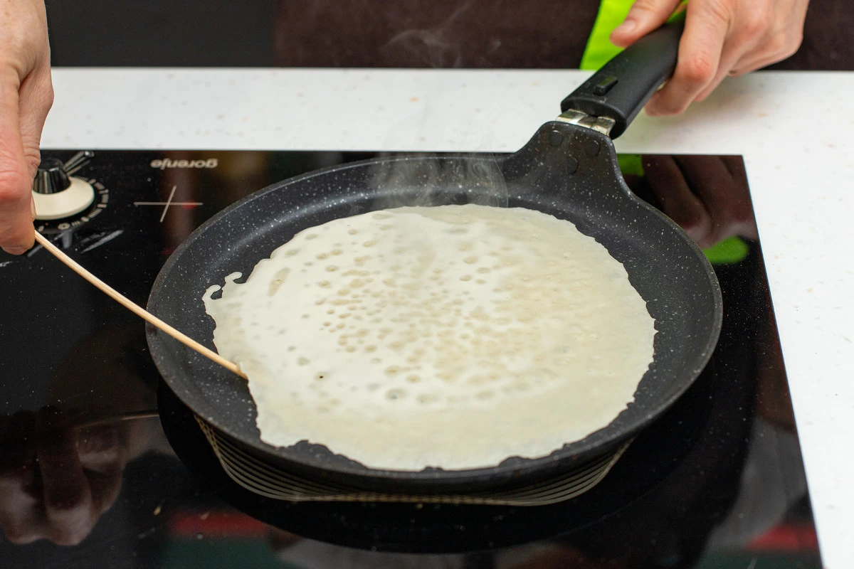 Жарьте блины как обычно — на горячей сковороде. Перед первым блином смажьте сковороду растительным маслом, дальше можно масло не добавлять.