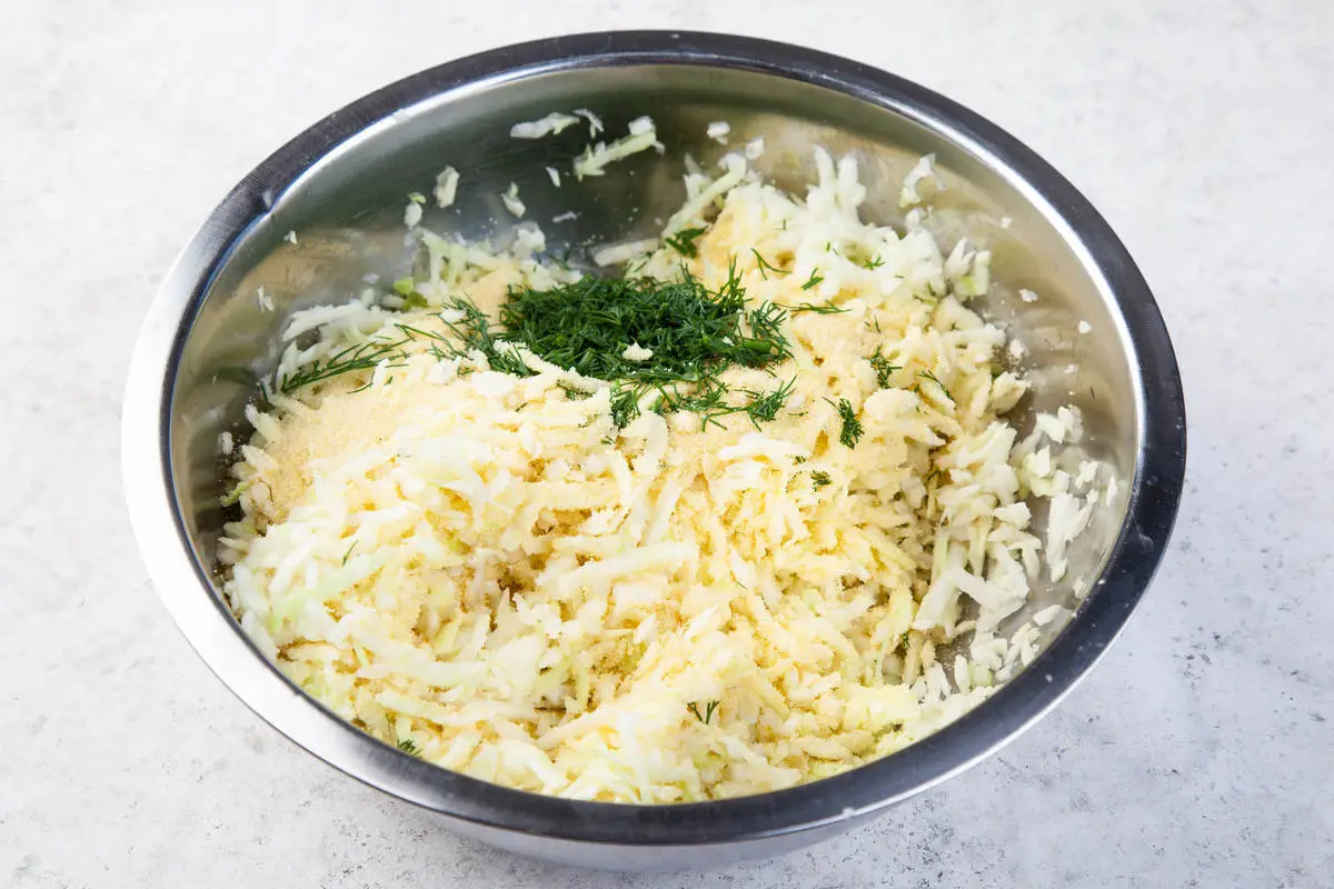 Капусту измельчите в блендере в крошку: если вам нравится максимально однородная консистенция, измельчайте дольше, если любите более выраженную текстуру — не мельчите. Посолите капустную крошку, тщательно помните руками, чтобы выделился сок. Затем добавьте манку и рубленый укроп, хорошо перемешайте и оставьте на 10-15 минут.