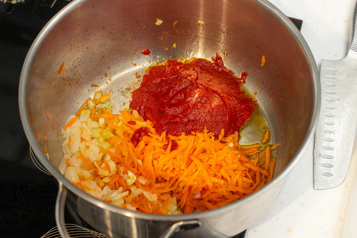В кастрюлю налейте масло. Выложите лук, чеснок и морковь. Добавьте томатную пасту, перемешайте и готовьте примерно 3-4 минуты.