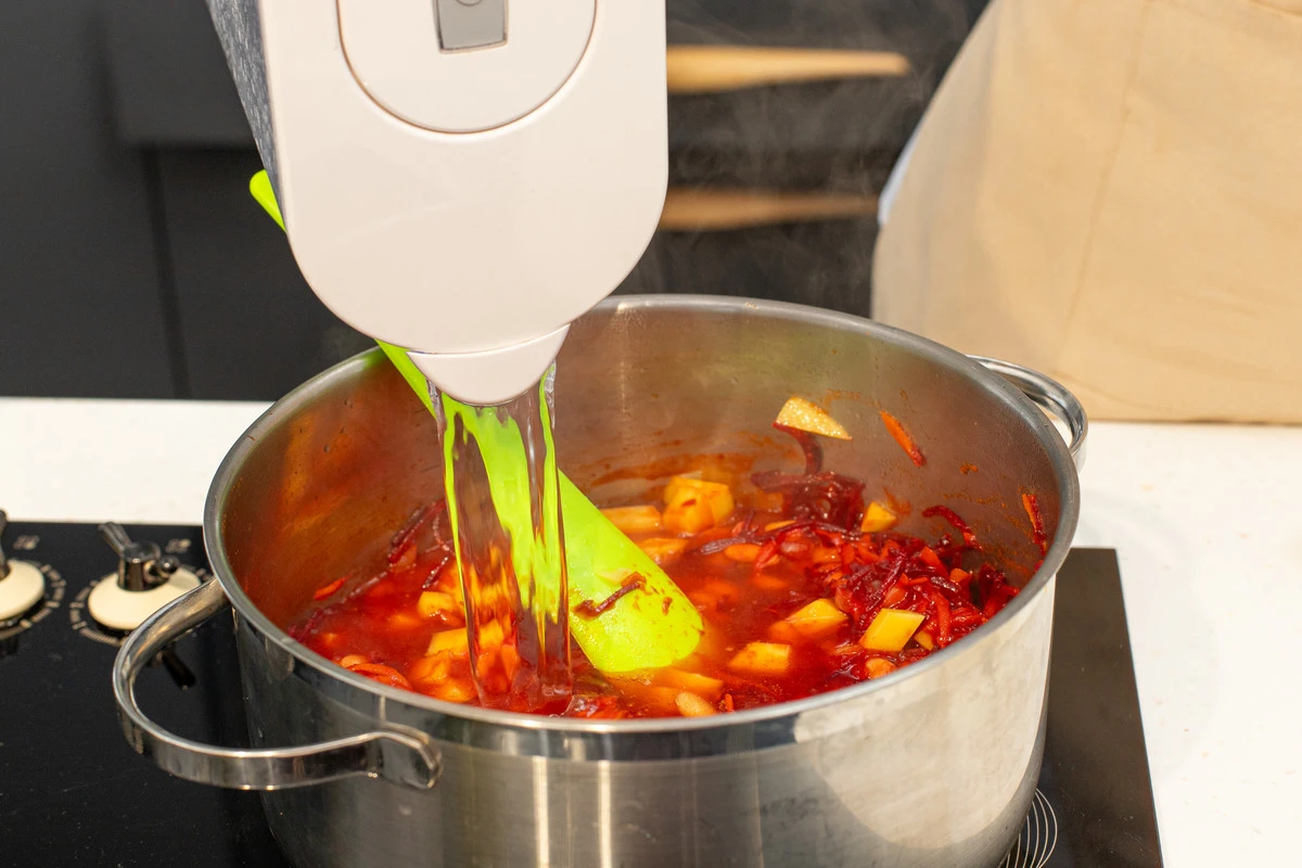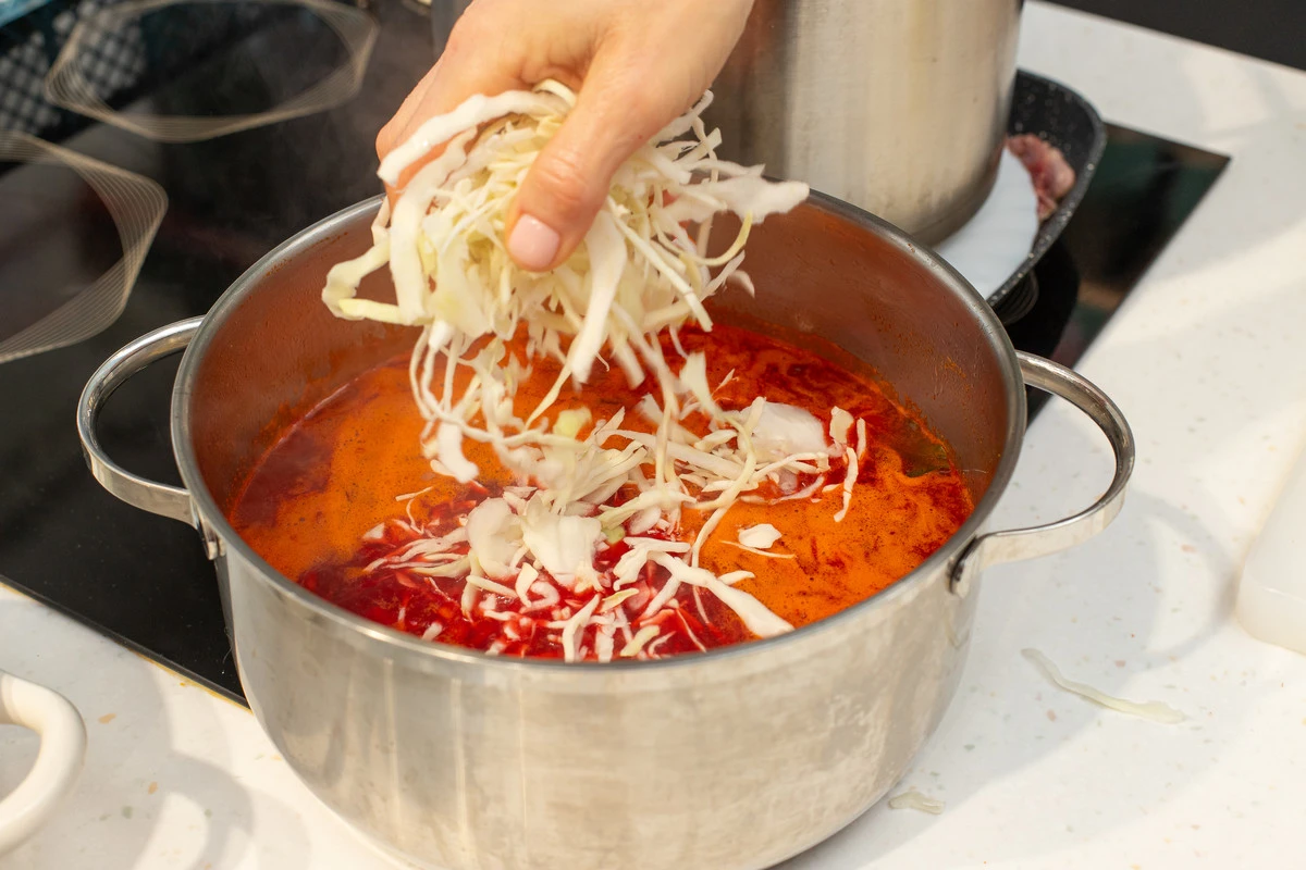 Как только борщ закипит, добавьте нашинкованную капусту. Варите в общей сложности 1 час.