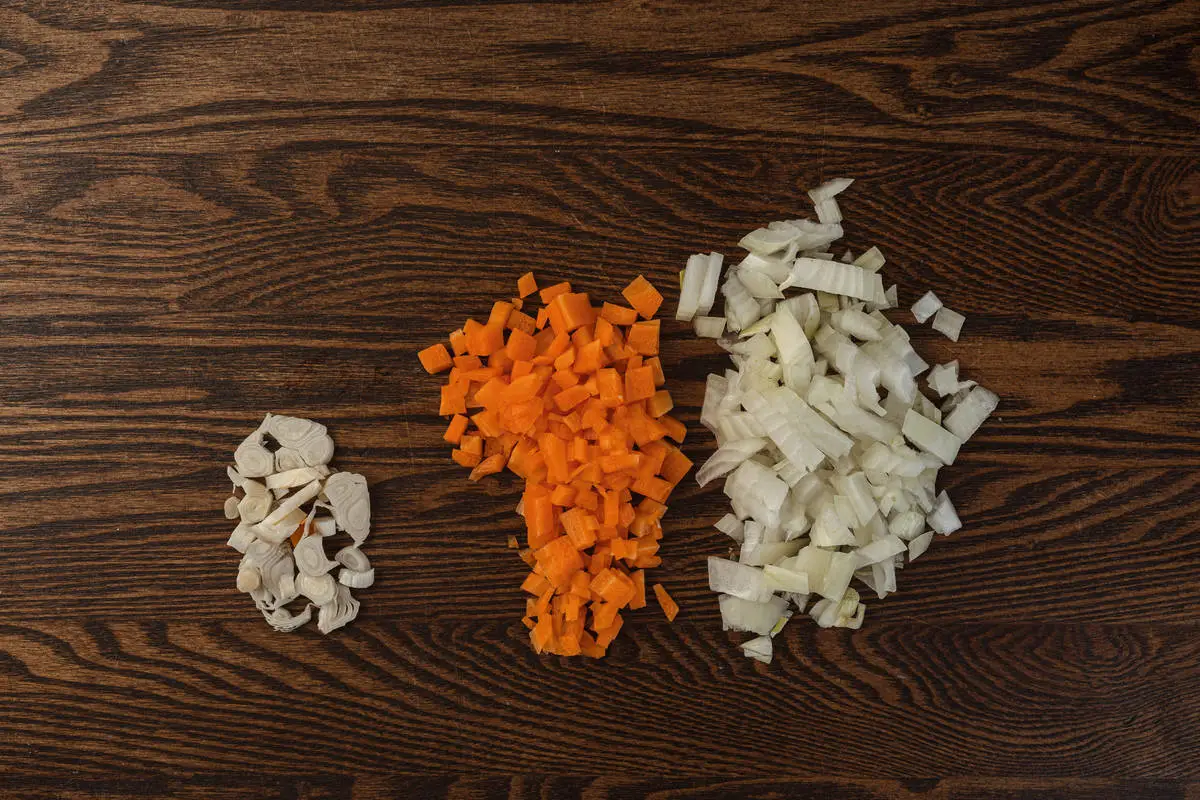 Лук и морковь нарежьте средними кубиками, чеснок измельчите. Из зубчиков чеснока удалите предварительно сердцевину (если у вас молодой чеснок, делать это не нужно).