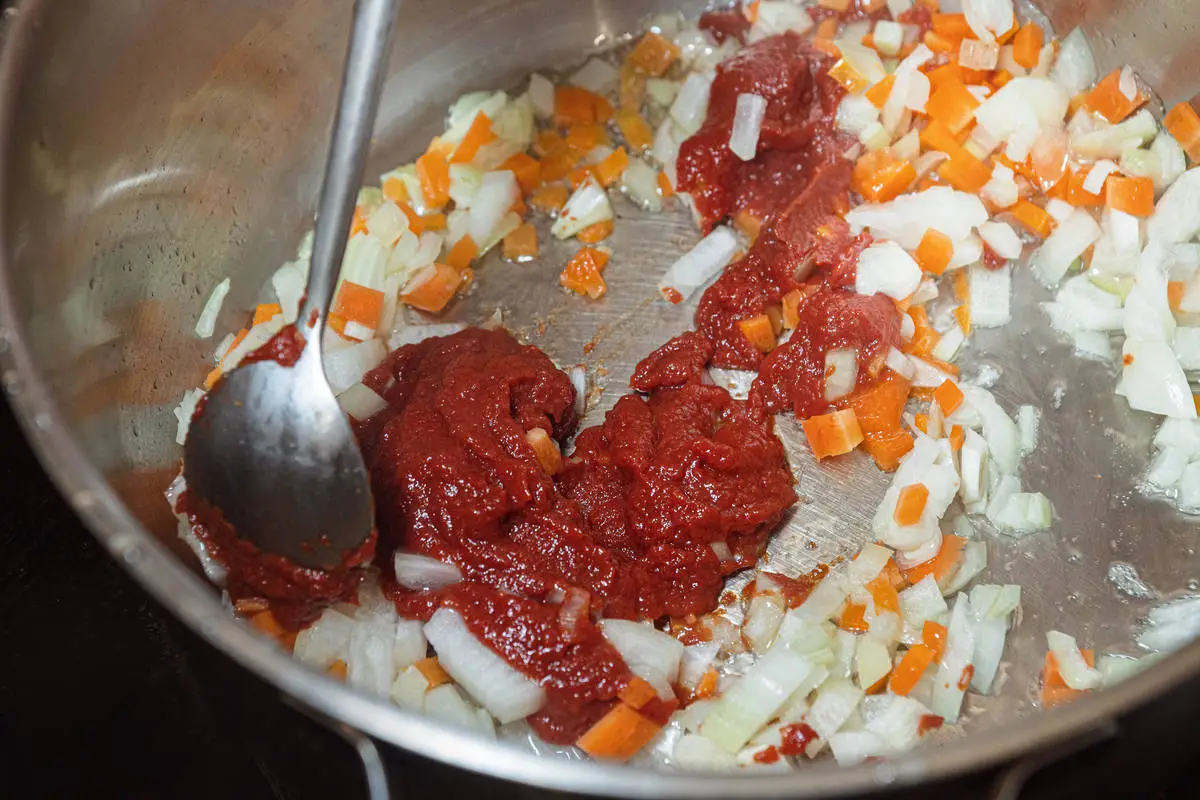 Обжарьте овощи на растительном масле, добавьте томатную пасту и куркуму (соль на этом этапе добавлять не нужно!), перемешайте и прогрейте пару минут.