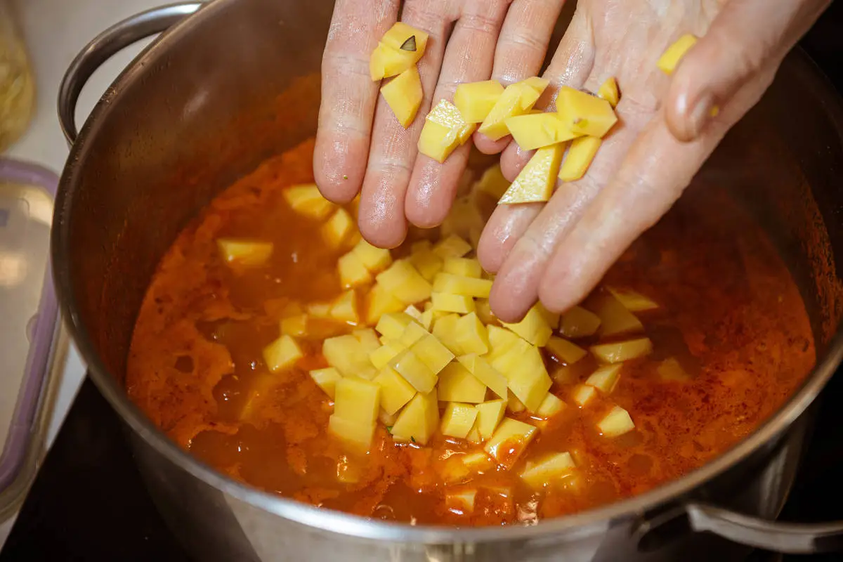 Очистите картофель и нарежьте кубиками, добавьте в суп. Варите ещё около 20 минут, в конце посолите по вкусу.
